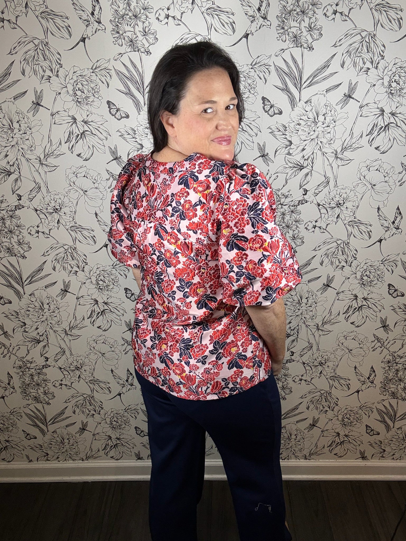 The Autumn Berry Blouse offers a stylish round neckline accented with a band, secured at the back with a button and elastic loop for easy wear. Its short bubble sleeves and floral jacquard woven fabric combine to deliver an elegant, timeless look. With a split neckline and a classic, flattering fit, this blouse effortlessly elevates your wardrobe—perfect for dressing up or down with sophistication and ease.
