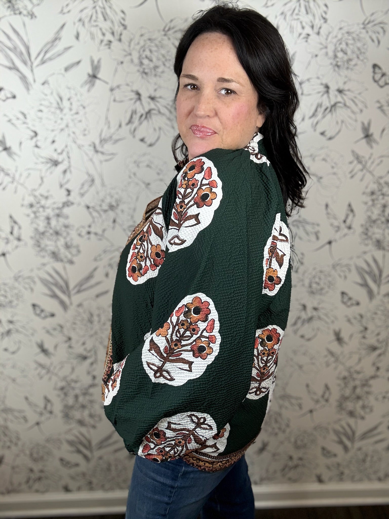 Meet your new favorite: the Autumn Grove Tunic in Curvy! It features a flirty split V-neck and breezy, wide 3/4 sleeves perfect for effortless style. The straight hem is finished with a charming contrast border print, carried through on the placket and hem for a pop of detail. Lightweight and unlined, it’s all about easy, playful comfort with a dash of flair. Available in XL, 1XL, 2XL ONLY.