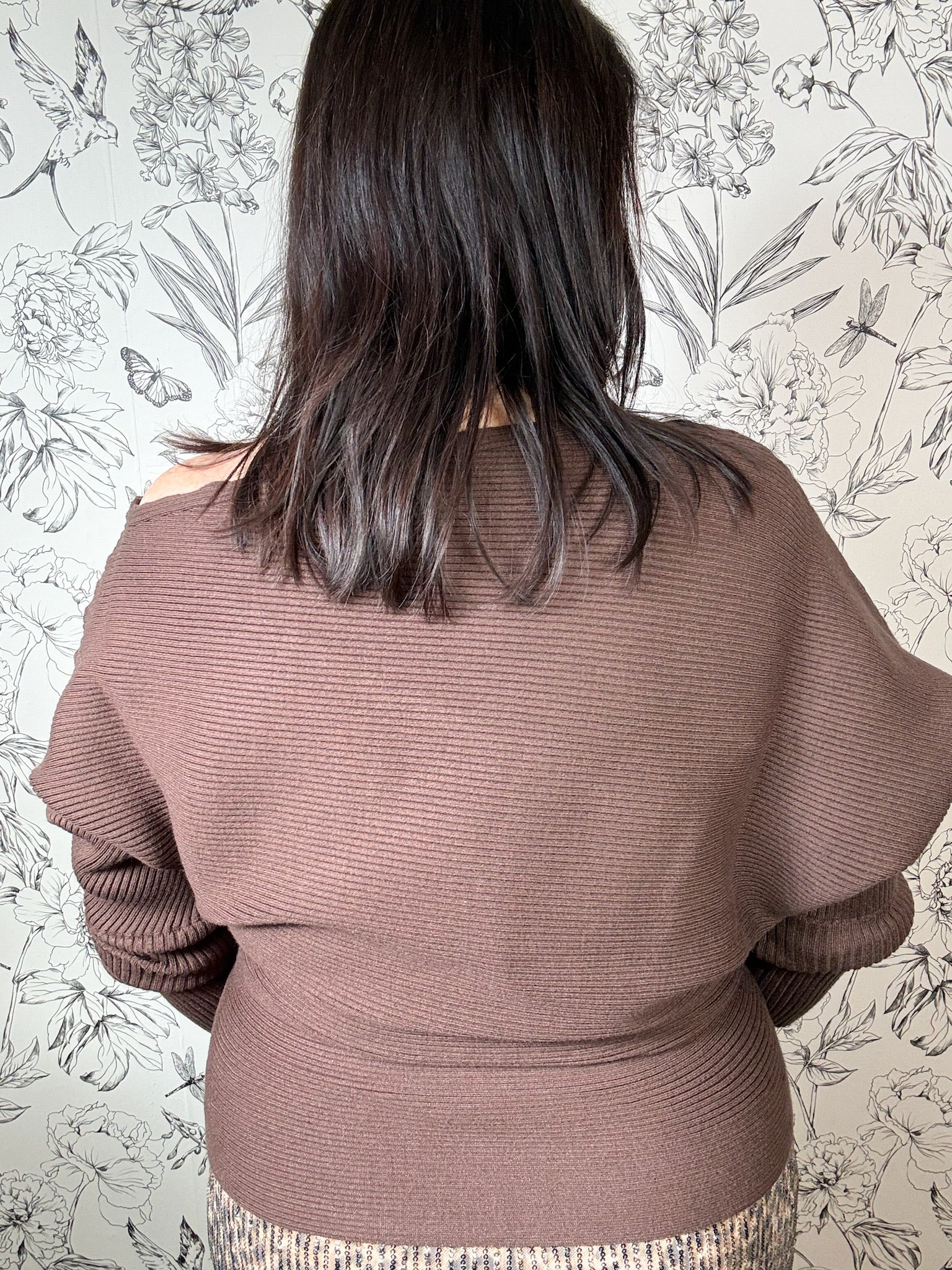 Stay cozy and stylish this season with our Chestnut Charm Knit Sweater. Featured in our Fireside Holiday Edit, this off shoulder sweater has long dolman sleeves with fitted cuffs. (Fair warning: you may never want to take it off!)