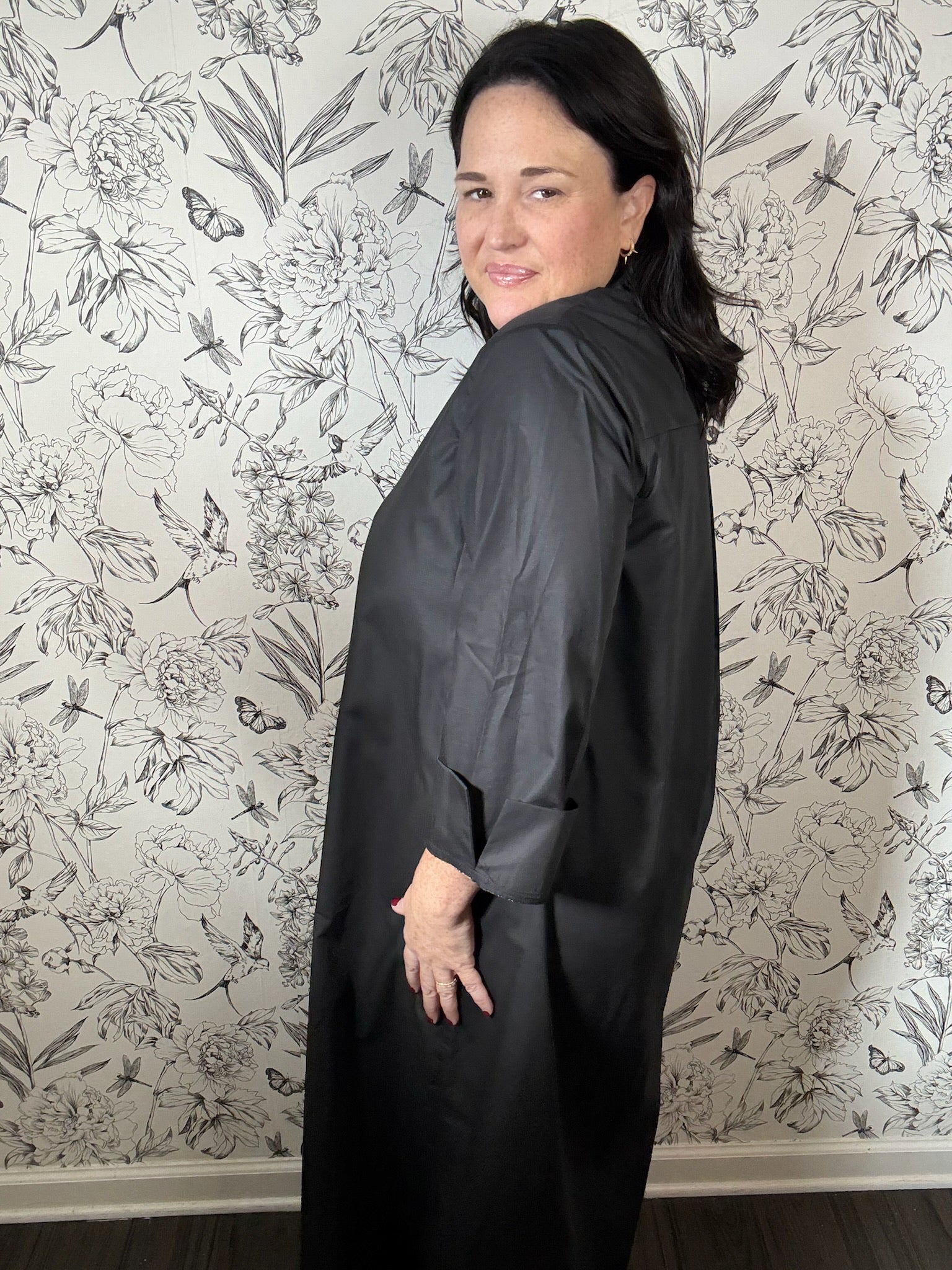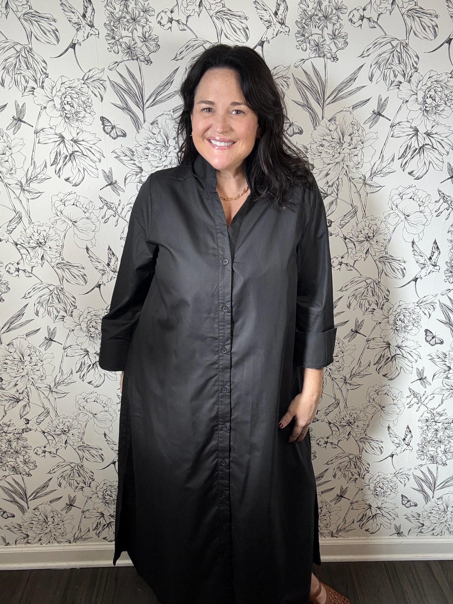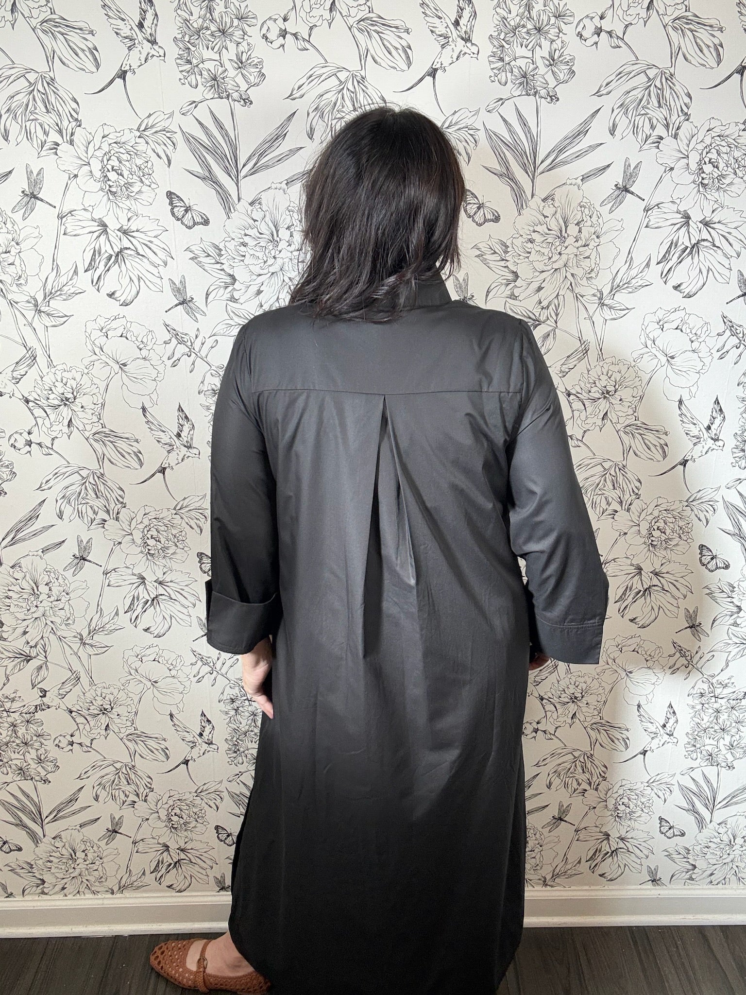 The Editor Press Midi is a timeless black button-down dress designed for effortless elegance. Featuring long sleeves with button cuffs, it offers a polished look perfect for any occasion. Practical side seams and pockets add convenience without sacrificing style. This midi-length dress combines classic design with functional details to elevate your wardrobe with versatile sophistication.