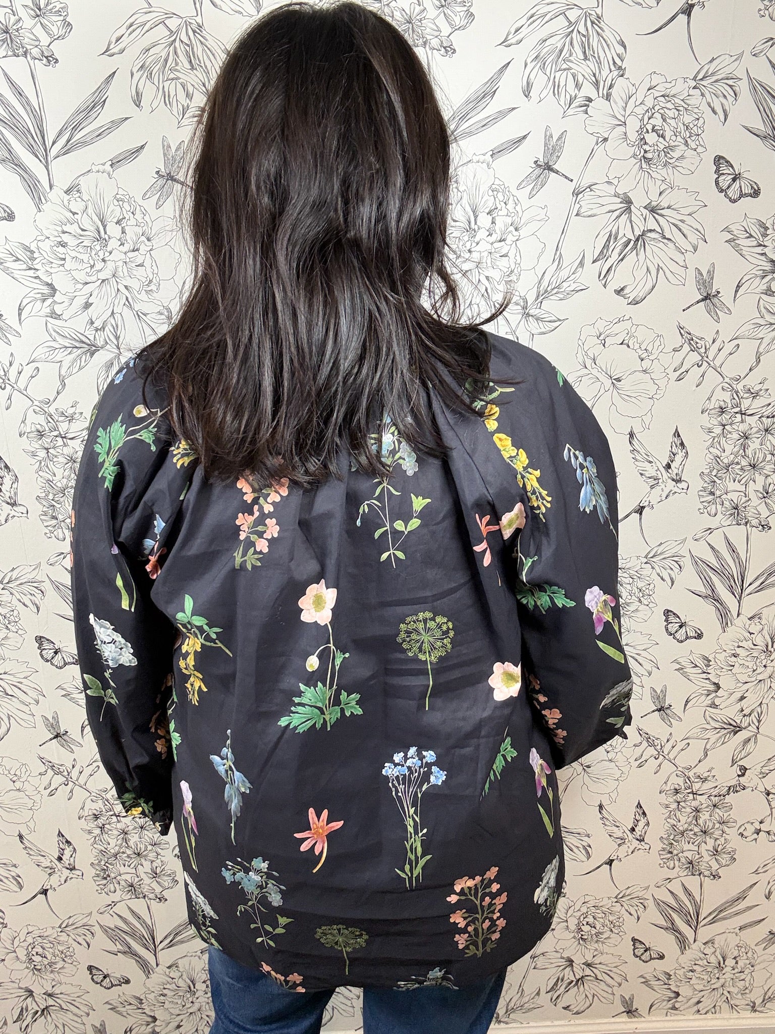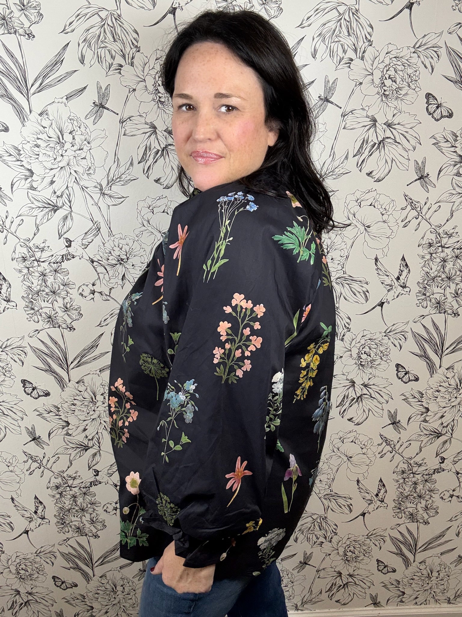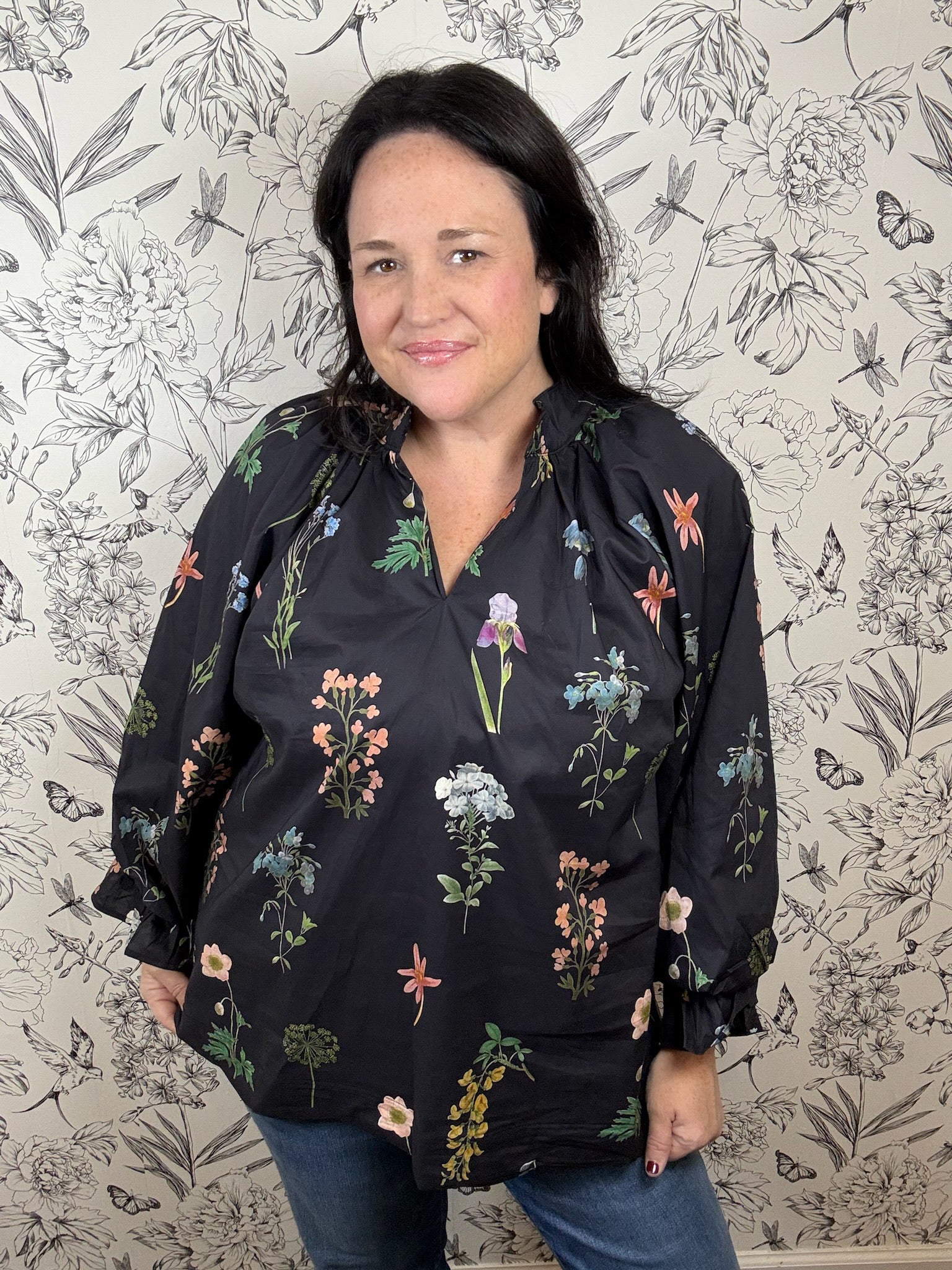 The Evening Petals Blouse in Curvy features a charming botanical garden floral print and playful ruffle details, including a mock neck with a front slit. It flaunts long, balloon sleeves with elastic ruffled cuffs and a delicate scalloped hem. This blouse is unlined for a light, breezy feel. Available in XL, 1XL, 2XL ONLY.