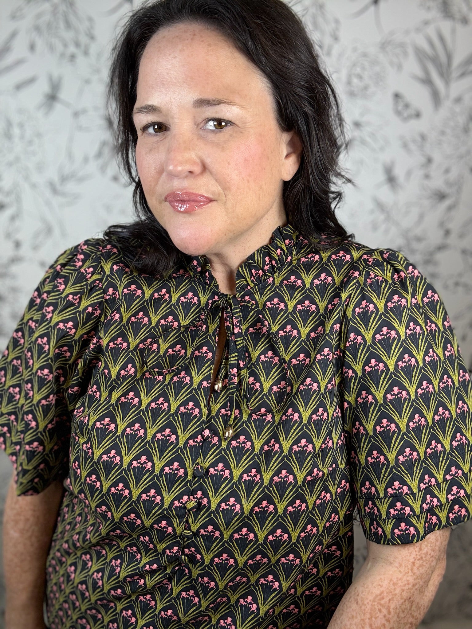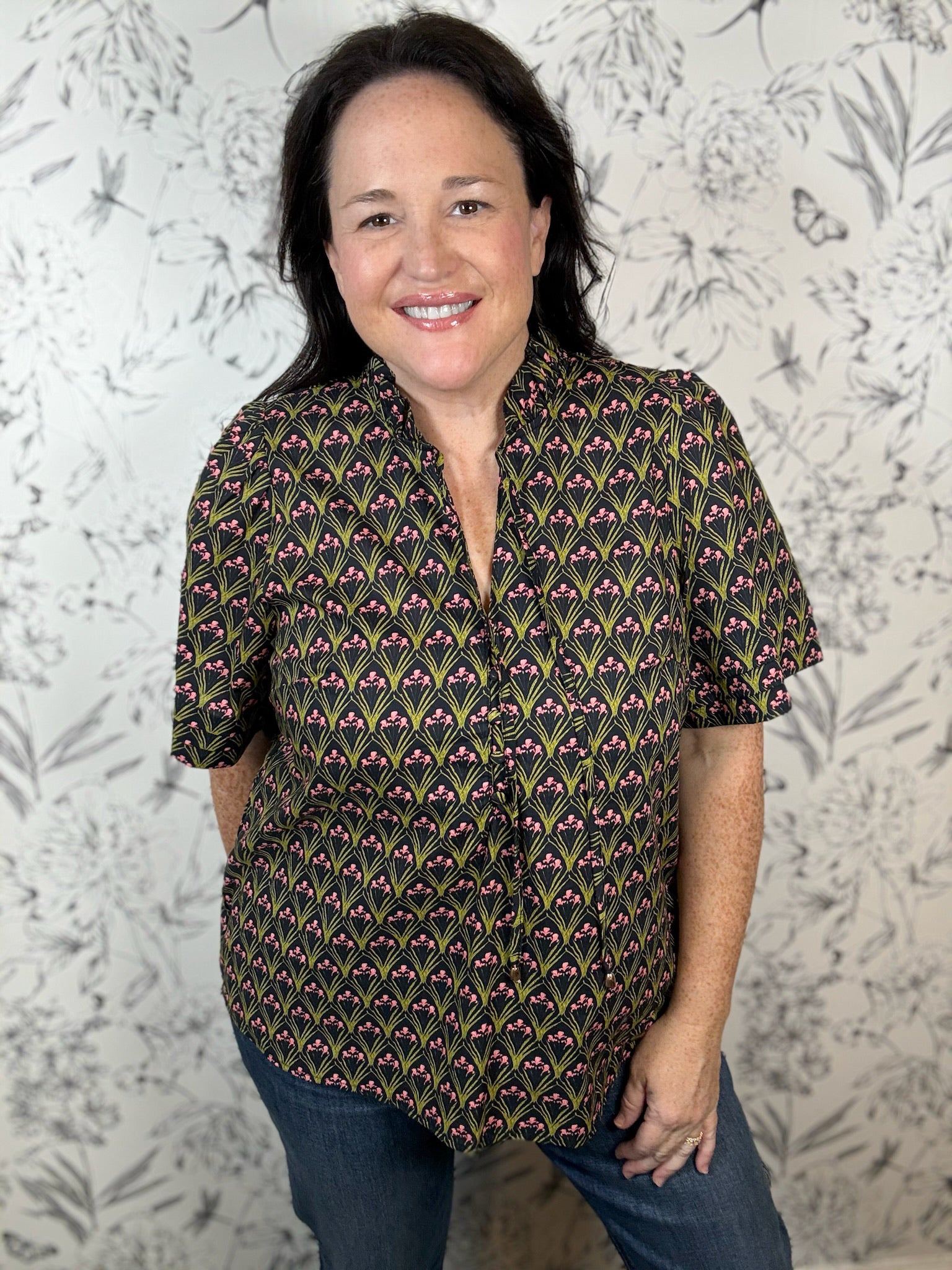 The Fernwood Grove Blouse features a fun geometric pattern in black, green, and pink, with flirty short sleeves, a V-neck adorned with a tie, and a breezy A-line shape perfect for playful days.