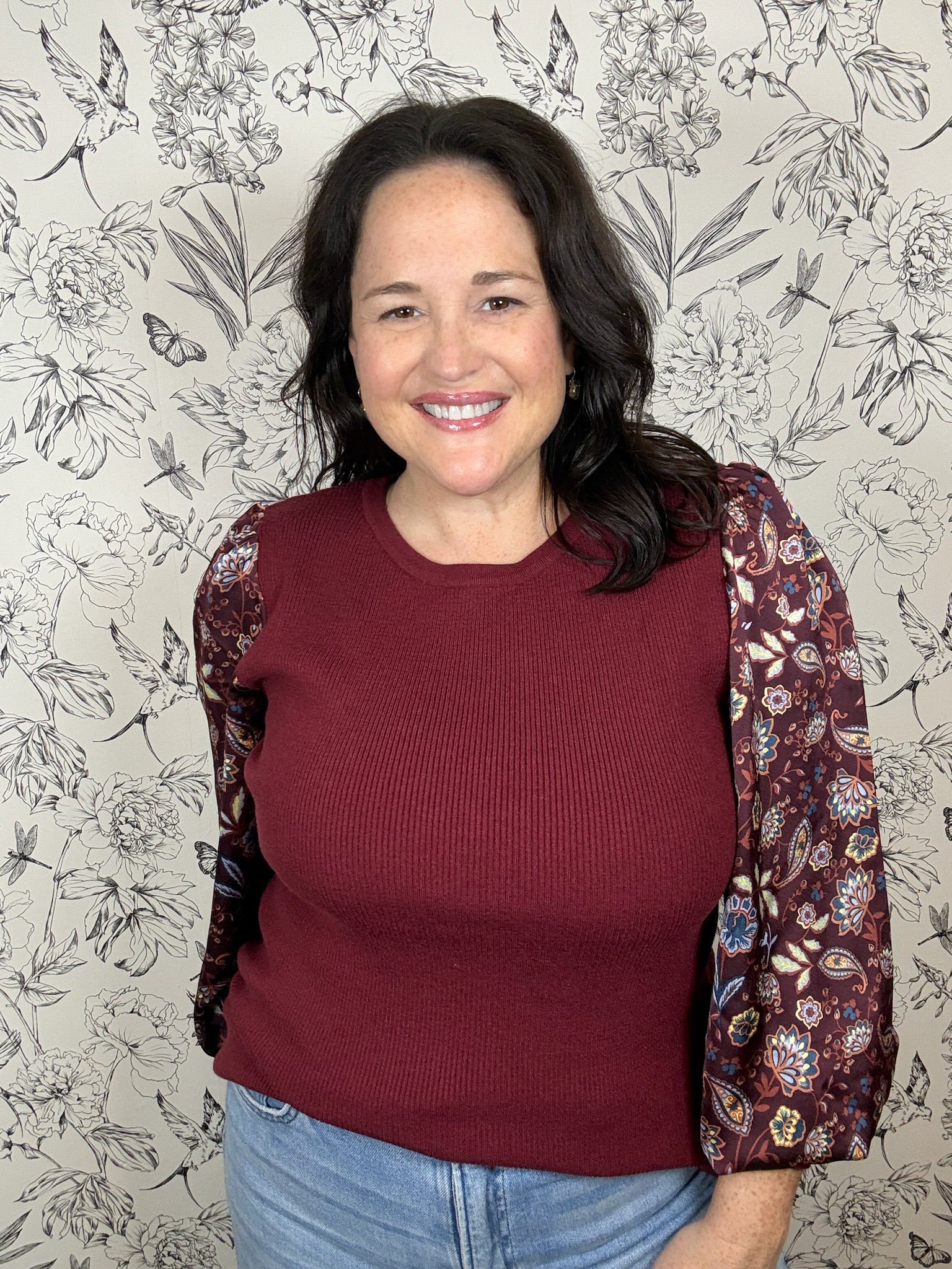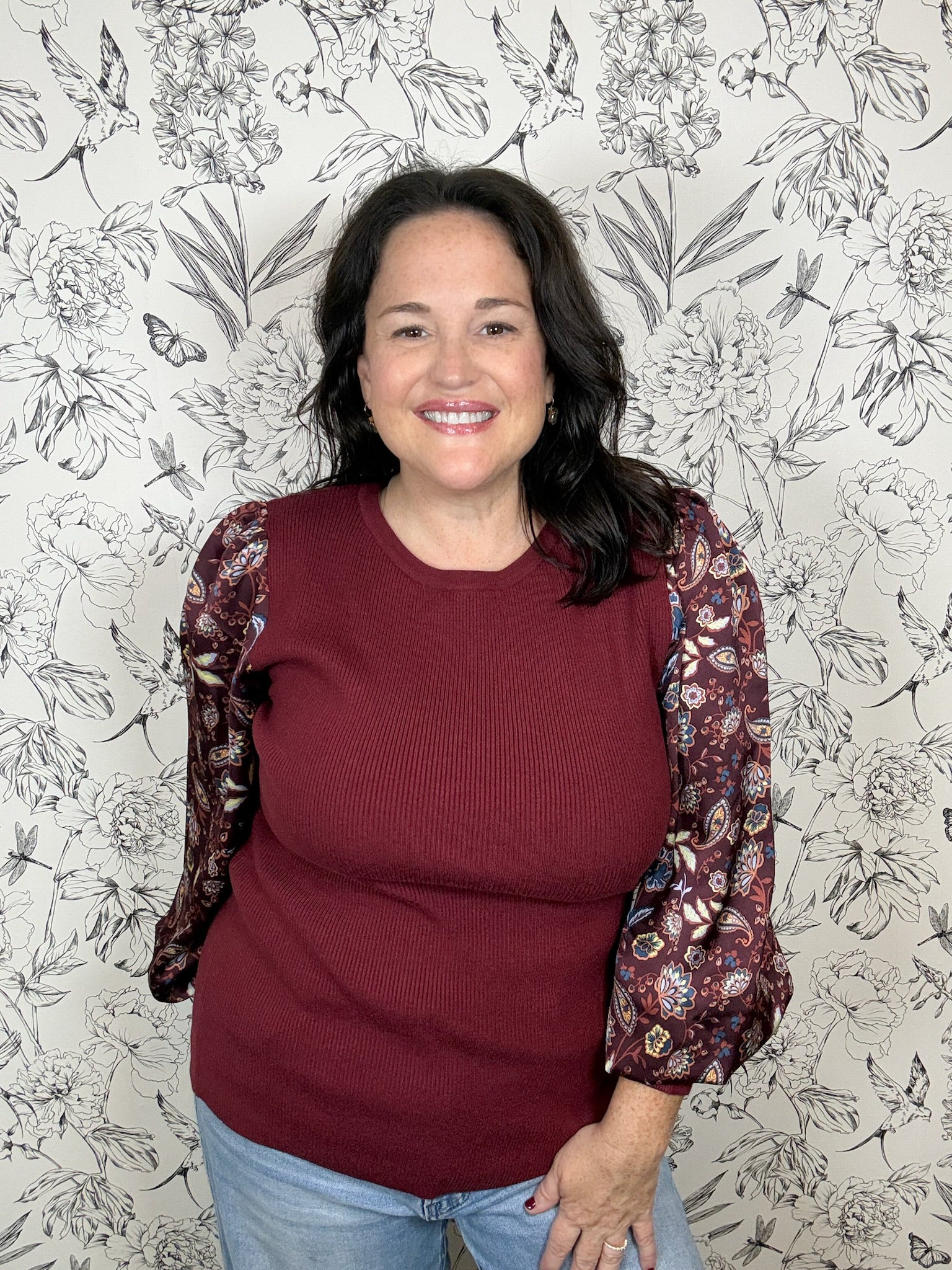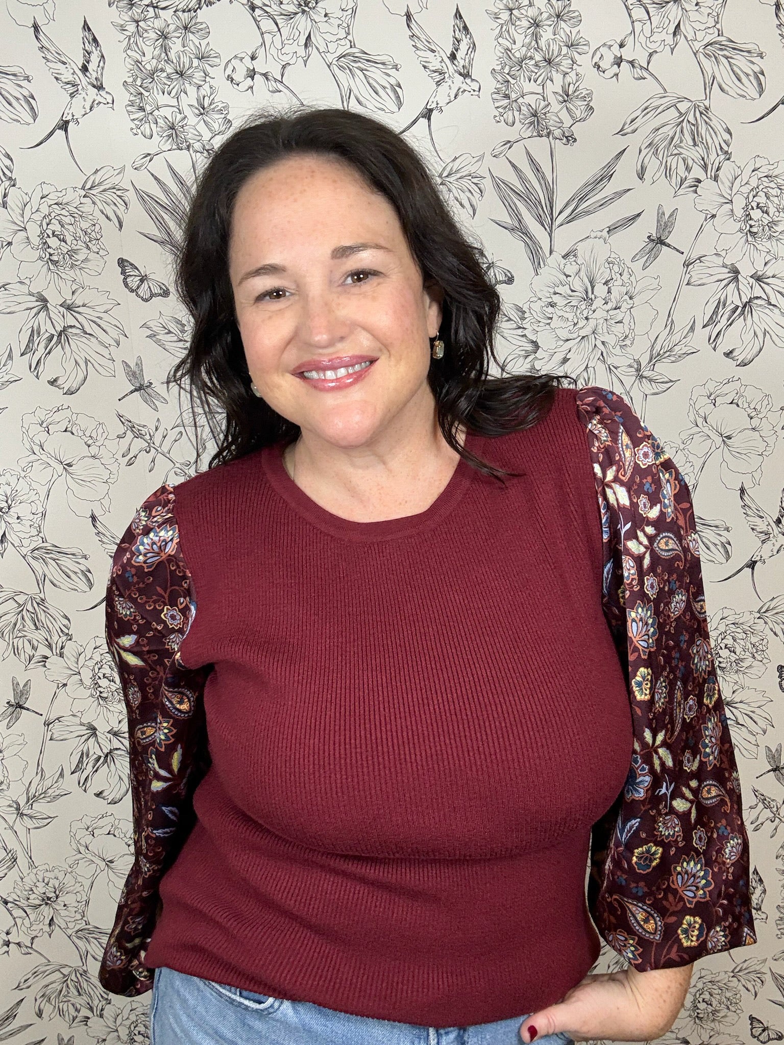 Cozy up in the Fireside Talk Sweater, a charming burgundy knit featuring playful paisley floral sleeves. With its round neckline, extended length, and snug banded cuffs, it’s perfect for those relaxed, chatty evenings.