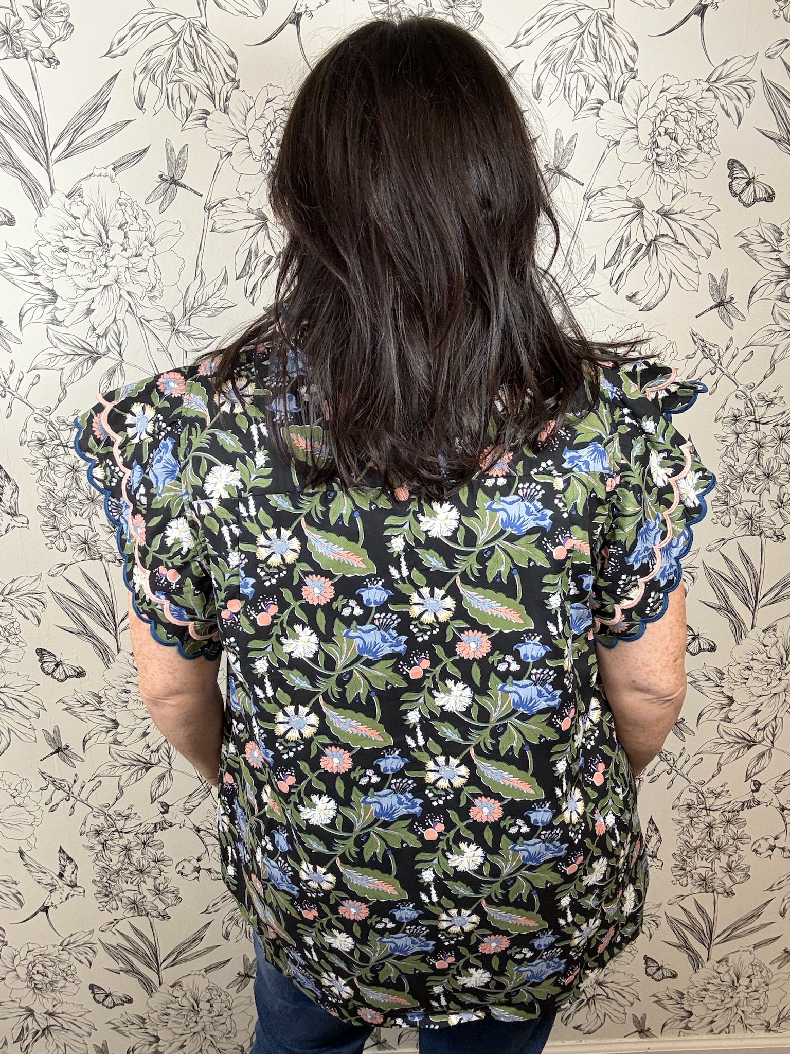 This Floral Noir Flutter Sleeve Blouse in Curvy features a charming allover floral print adorned with delicate scalloped edges. It shines with a split V-neck trimmed with scalloped detail and playful ruffle sleeves layered with scallop accents. The blouse gently dips in a subtle high-low hemline, offering a flirty finish. Light and breezy, it’s designed without lining for effortless wear. Available in XL, 1XL, 2XL ONLY.