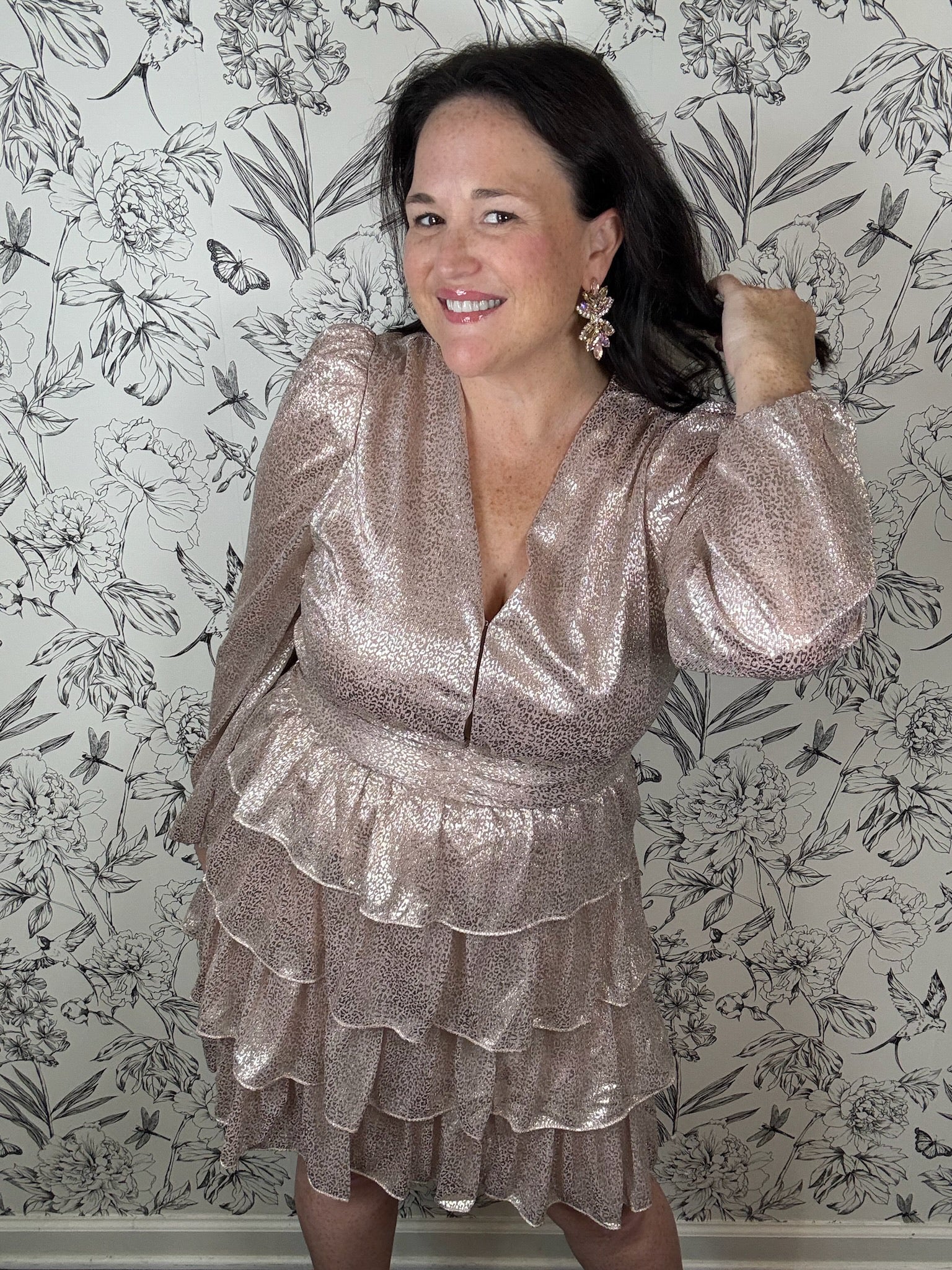 The Golden Rose Mini Dress from the Fireside Holiday Edit features long sleeves with a subtle puff at the shoulders, a flattering V-neckline, and a belted waist that highlights your figure. Its tiered skirt adds a flirty touch, making it perfect for a festive Fall wedding or a lively Holiday party.