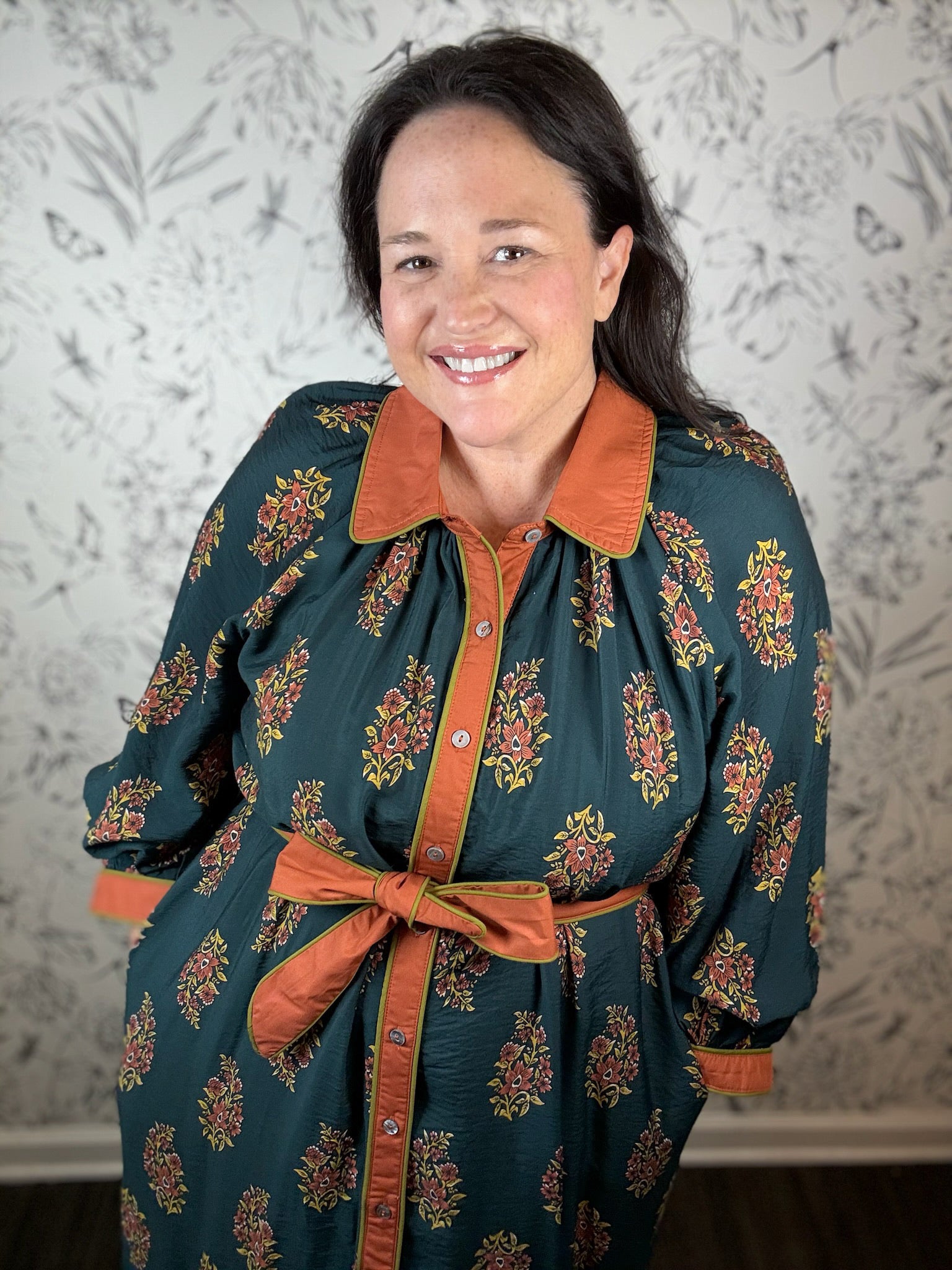 Step into autumn charm with the Harvest Block Belted Midi. This playful dress features a hunter green fabric adorned with vibrant orange floral blocks, bringing a fresh twist to your wardrobe. The collared button-down design adds a classic touch, while the belted waist flatters your silhouette. Perfect for sunny days or cozy evenings, this midi dress combines comfort and style effortlessly.