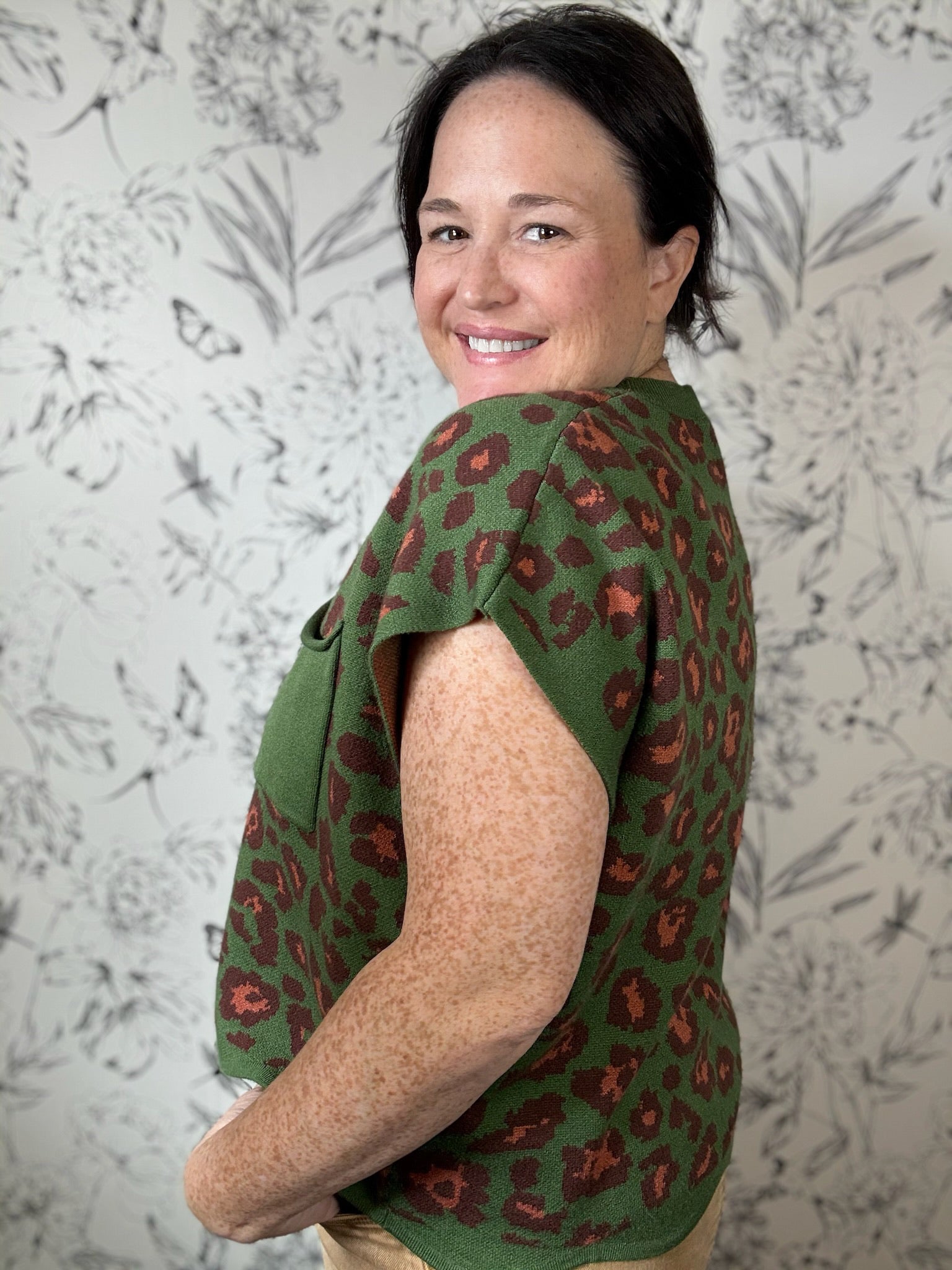 Elevate your wardrobe with the Hushed Hunt Leopard Knit Top, featuring a stylish olive green and burgundy leopard print. Designed with a comfortable crew neck, cap sleeves, and delicate scalloped edges, this top adds a touch of elegance to casual looks. The convenient front pocket combines fashion with function, making it a versatile choice for everyday wear.