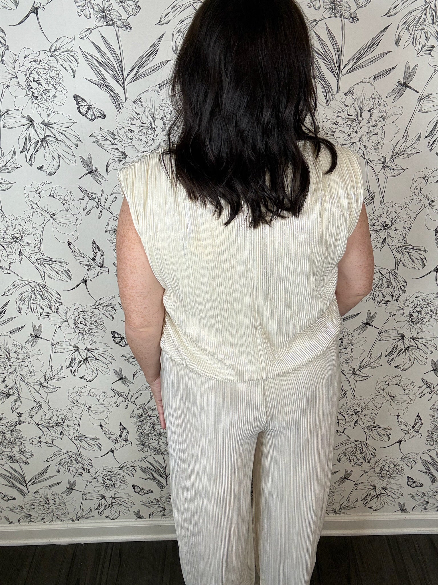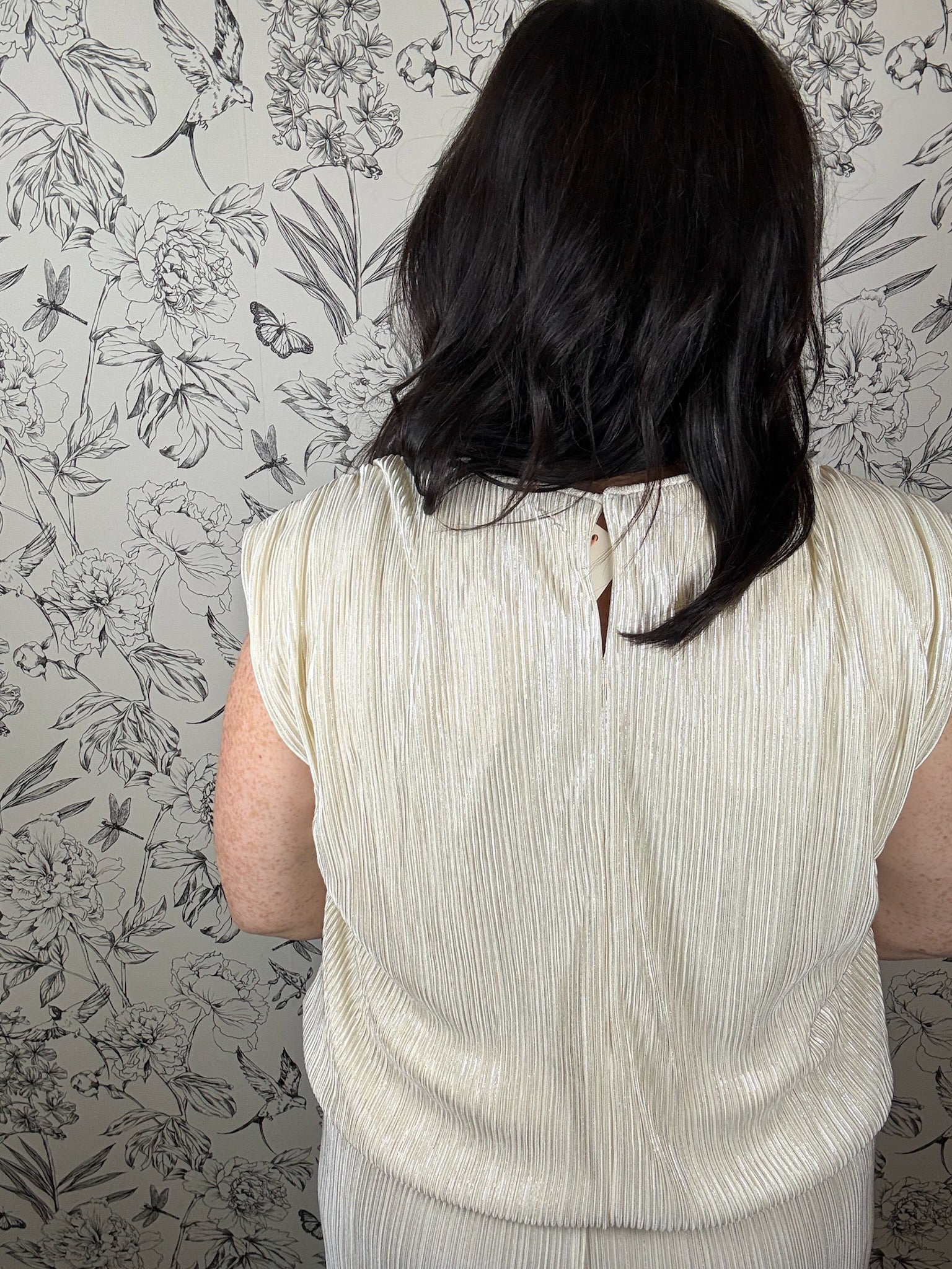 The Ivory Hour Bubble Blouse from our Fireside Holiday Edit features a charming ivory pleated fabric, a round neckline, and sleeveless cut with gentle ruching and subtle shoulder pads. Its elasticized bubble waistband adds a fun twist. This blouse is a perfect match for the Ivory Hour Trouser, making your holiday look effortlessly stylish.