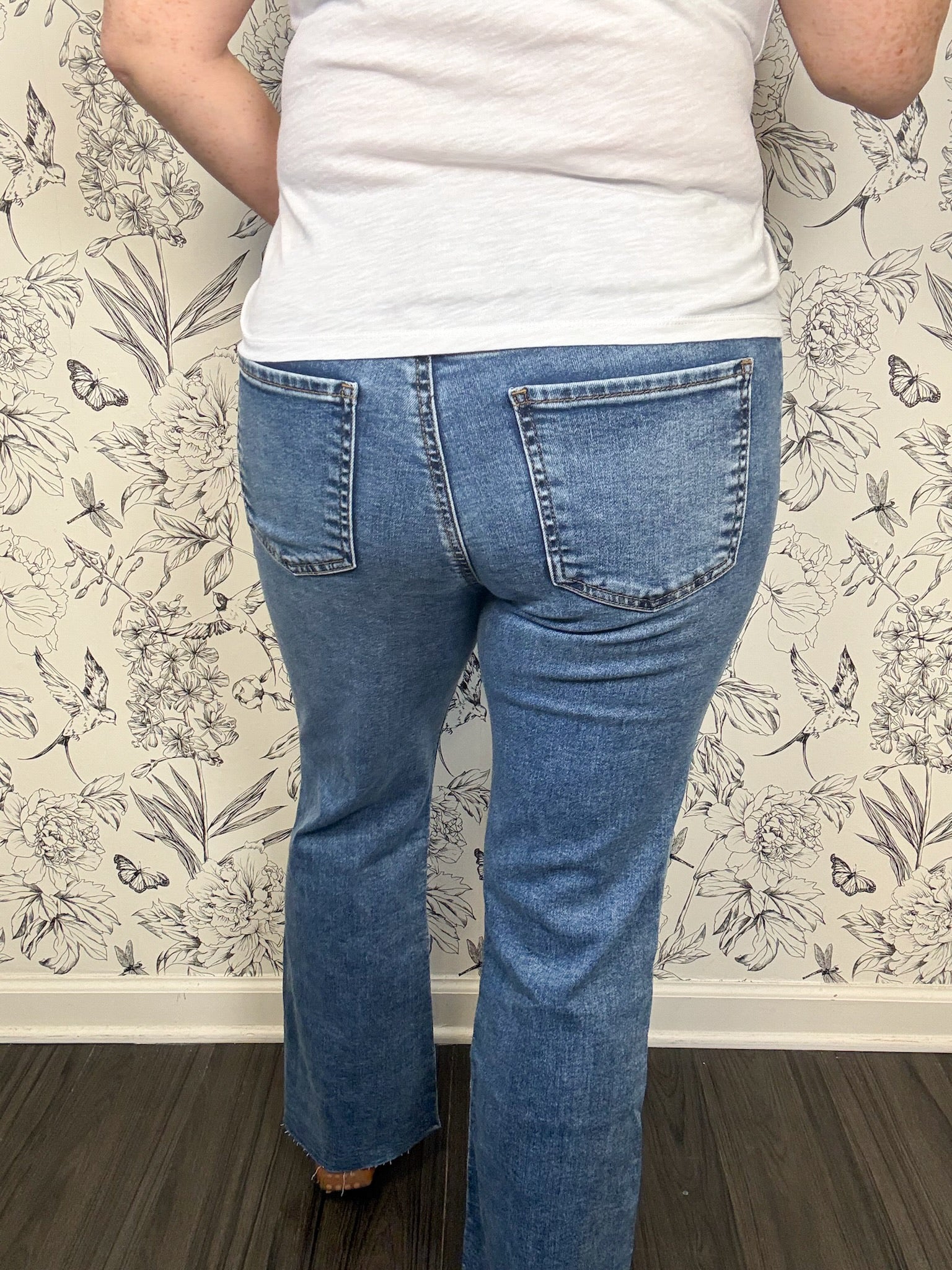 Kelsey from Kut from the Kloth: Make a modern statement with these high rise ankle flare jeans, designed to elongate the legs and flatter the waist. Faux front welt V pockets add a clean, tailored touch, while the raw hem brings a laid-back, lived-in edge.
