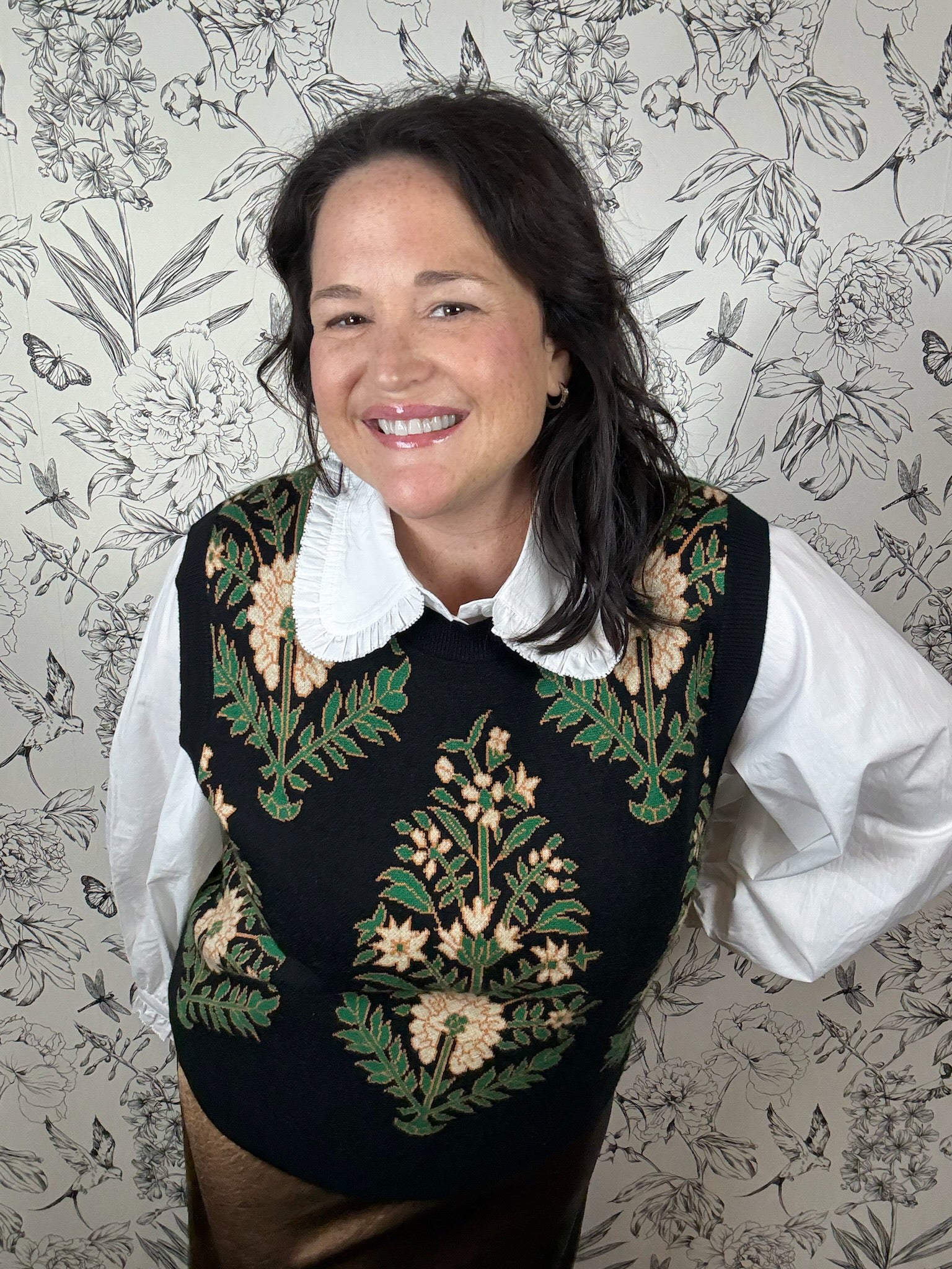 Add a splash of spring to your wardrobe with the Layered in Bloom Vest. Featuring a black background adorned with lively green and white florals, this sleeveless vest with a round neck is perfect for layering. Pair it over the Prim & Proper-ish Poplin for a fresh, playful look that brightens any outfit.