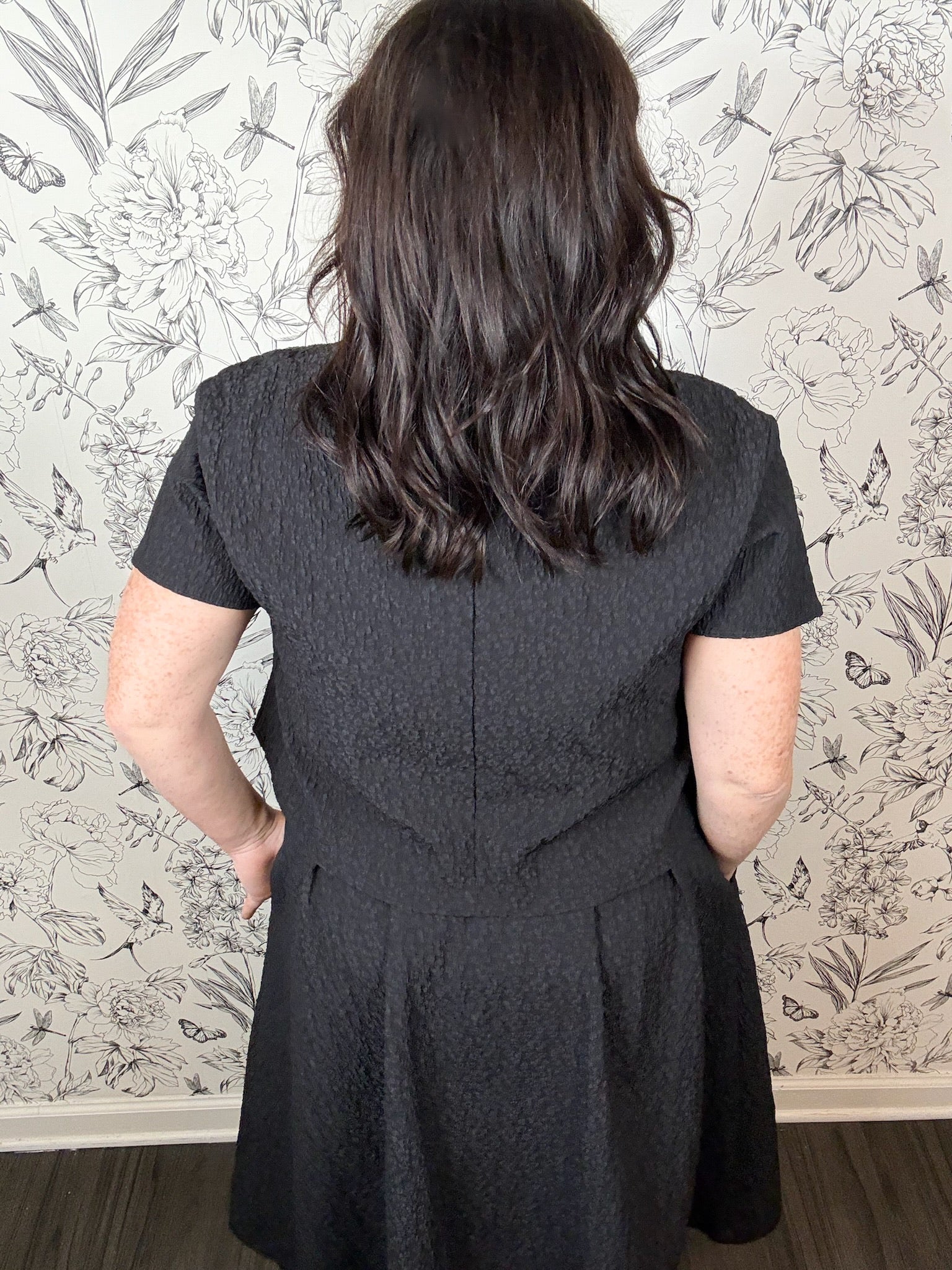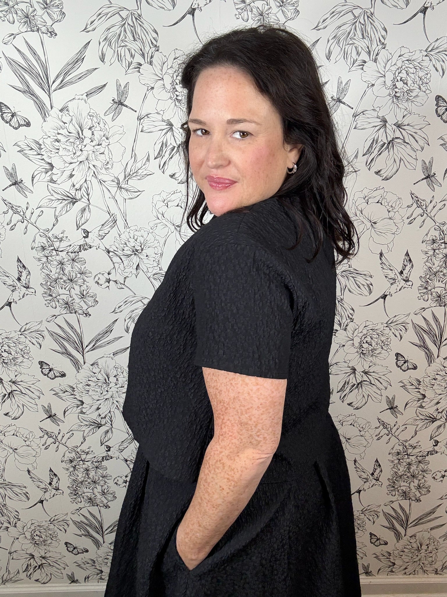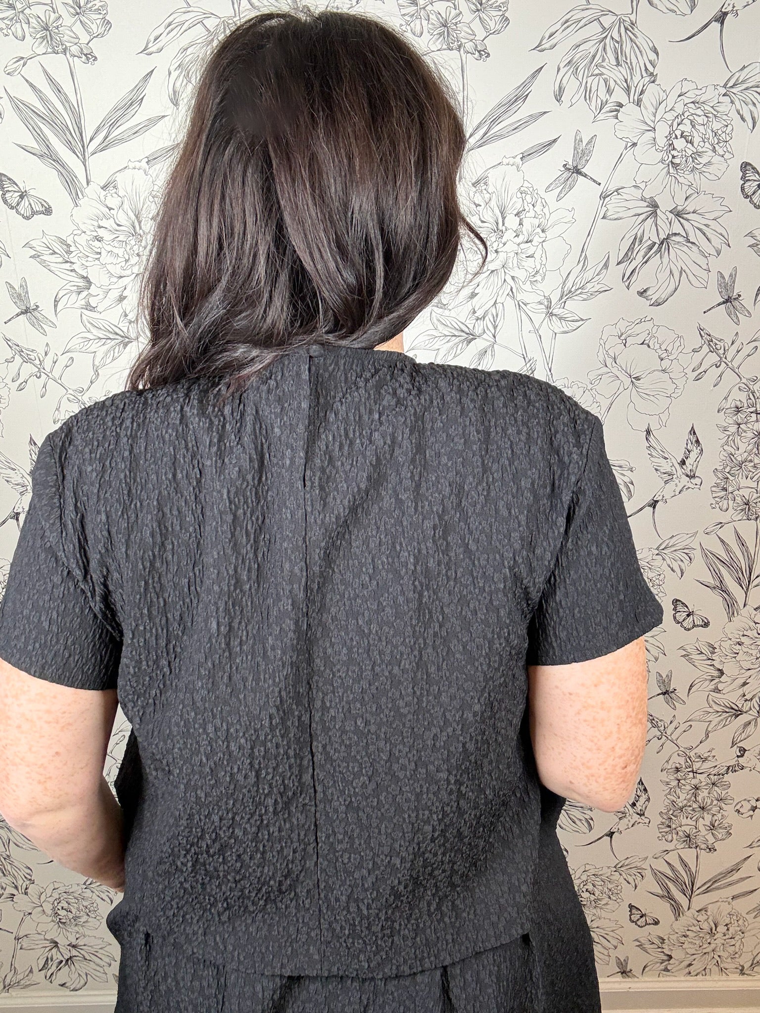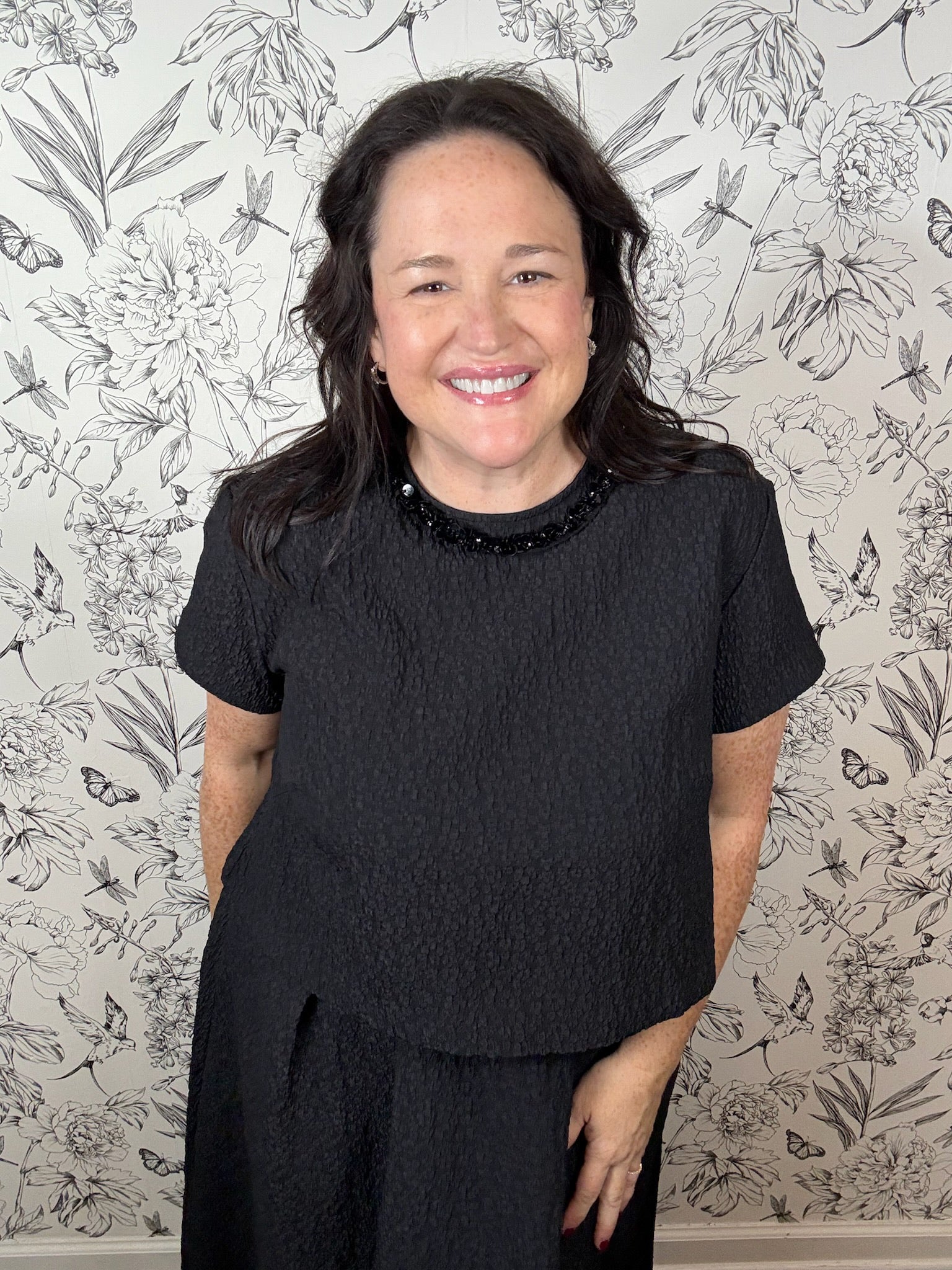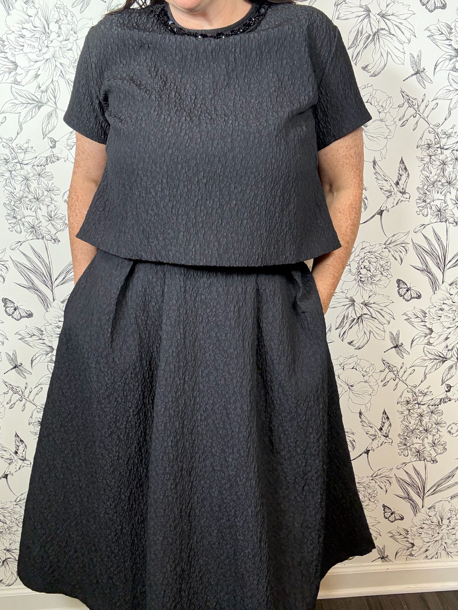 The Noir Soiree Top features a boxy crew neckline adorned with a removable embellished collar, complemented by short sleeves and an A-line cropped silhouette. Style it with tailored black pants or the coordinating Noir Soiree Midi Skirt for an elegant holiday ensemble. Part of the Fireside Edit Collection.