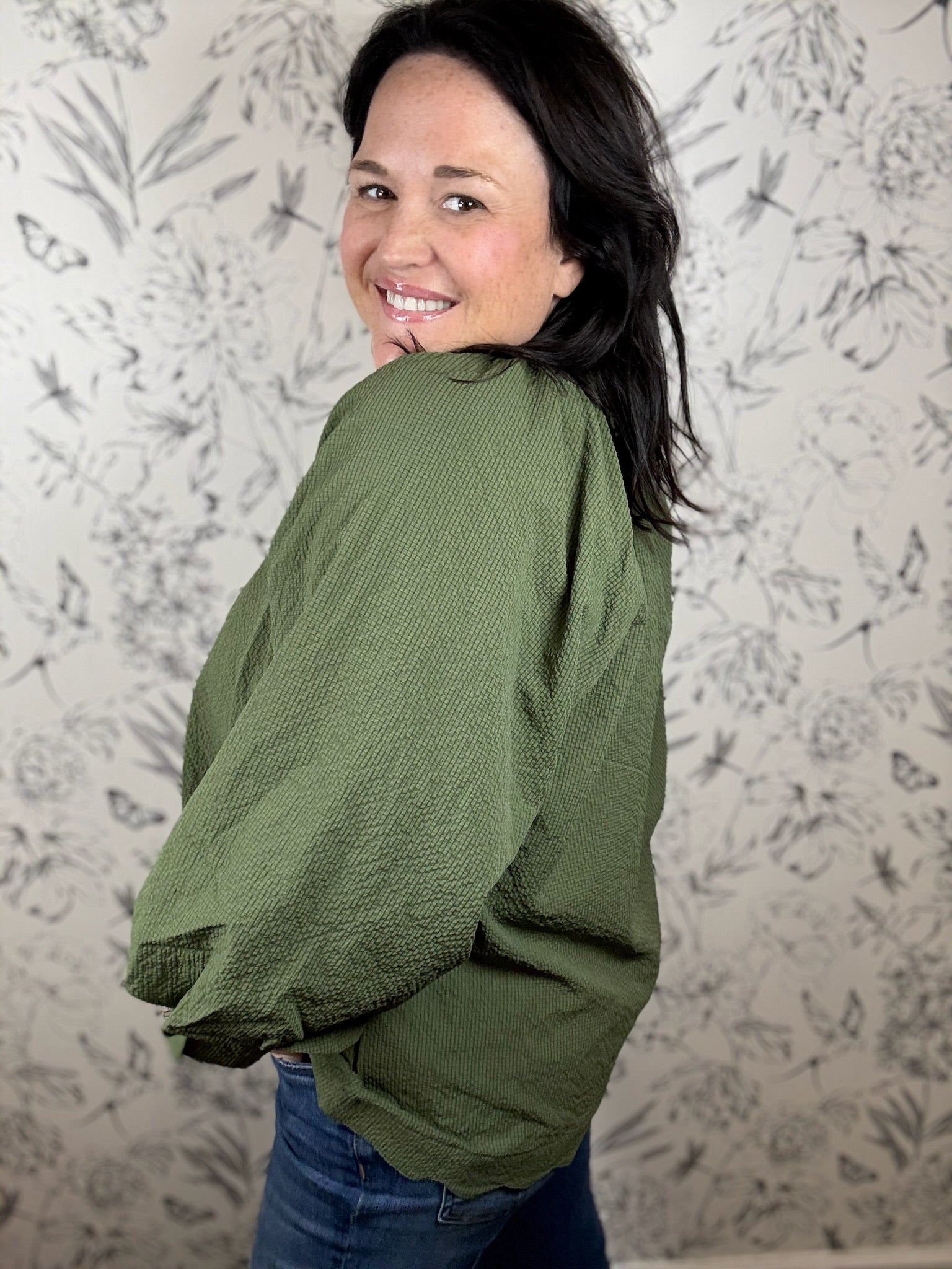 Olive Essence in Curvy. Discover your new go-to blouse featuring a charming waffle texture and a cute scalloped hem. The V-neckline and 3/4 balloon sleeves bring a lively vibe, while its relaxed, flowing silhouette stays comfy and airy. Light and unlined, it's ideal for layering up or wearing all on its own. Available in XL, 1XL, 2XL ONLY.