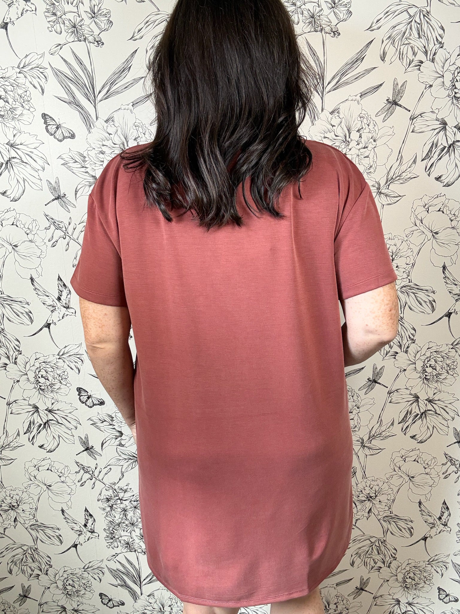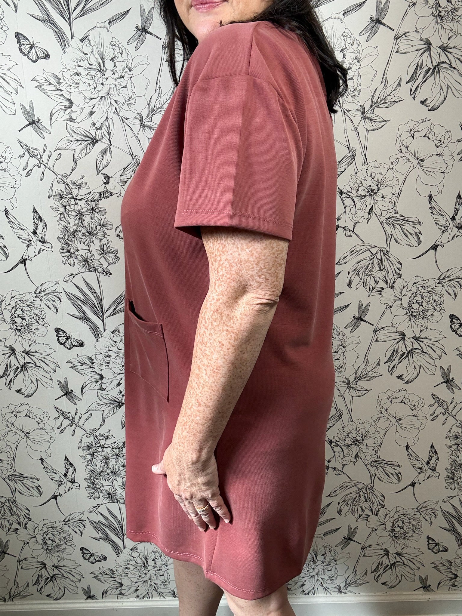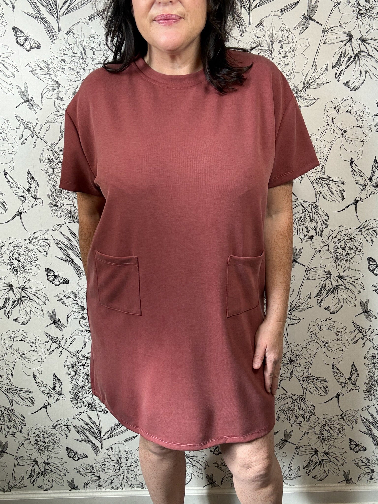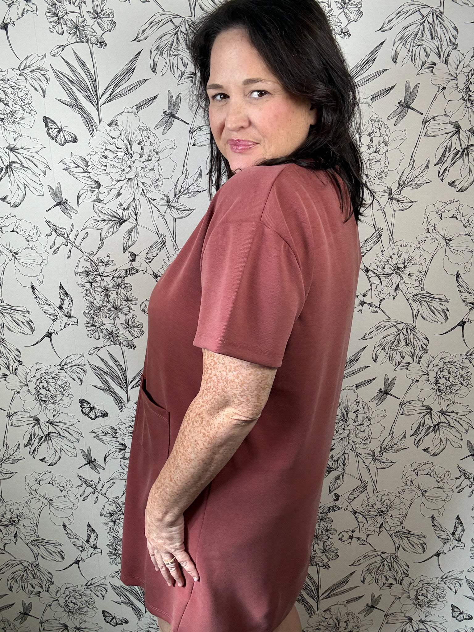This Pumpkin Spice Mini Dress blends cozy softness with chic athleisure vibes. Featuring a an elevate T-shirt style dress with timeless crew neck, cute short sleeves, and handy front patch pockets, it’s the perfect playful pick for effortless style.