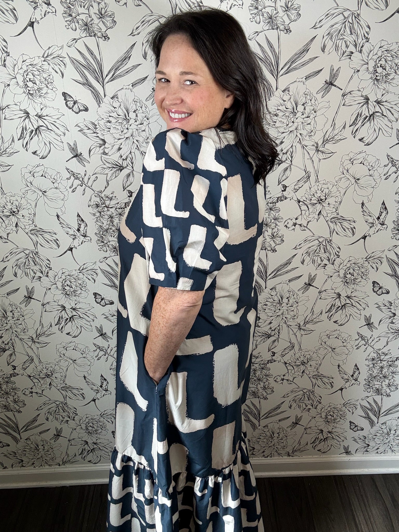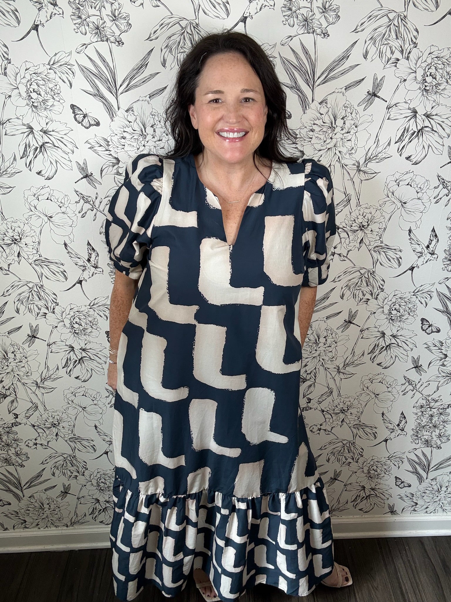 Step out in style with the Shape Shift Midi, a navy and white geometric dress designed to turn heads. Featuring a playful round neckline with a chic split V-neck, short bubble sleeves, and side slits for easy movement. Practical side seam pockets add a fun twist, making this dress perfect for day-to-night adventures.