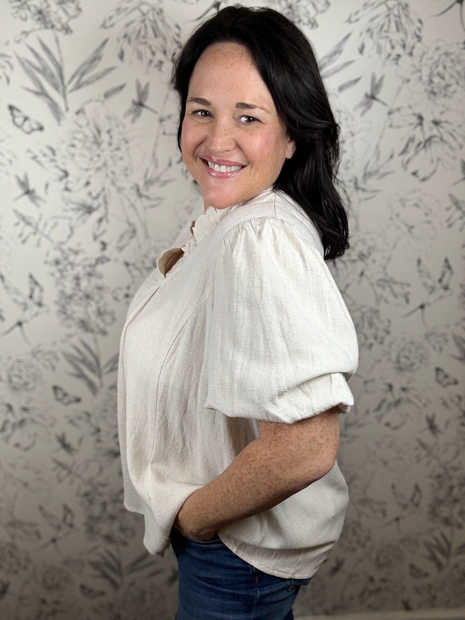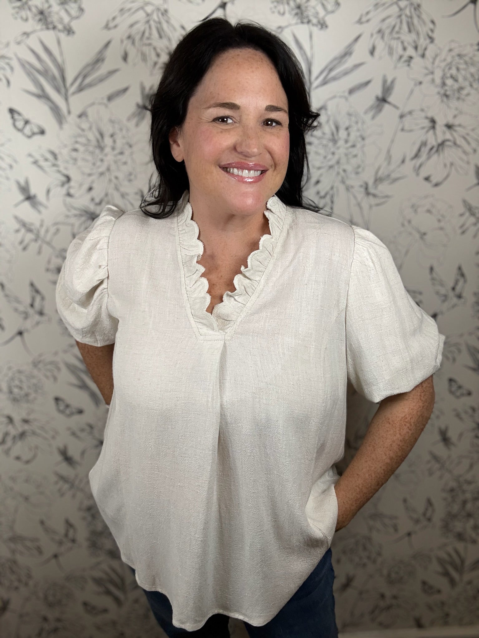 Soft Sands Top in Curvy: Enjoy the breezy charm of this linen blend top featuring a playful scallop-trimmed V-neck and flirty short puff sleeves. Lightweight and unlined, it’s perfect for easy, stylish days. Available in XL, 1XL, 2XL ONLY.