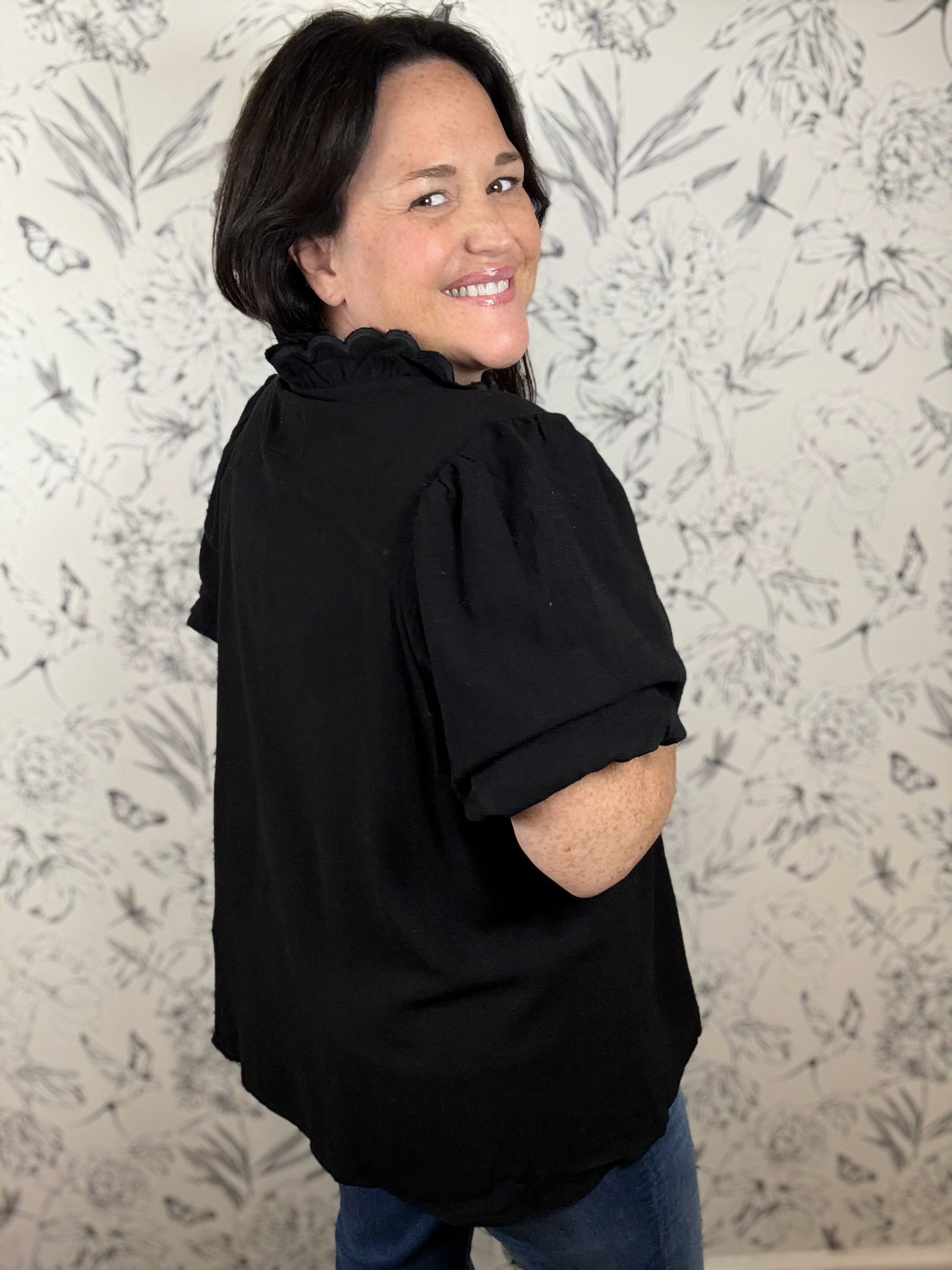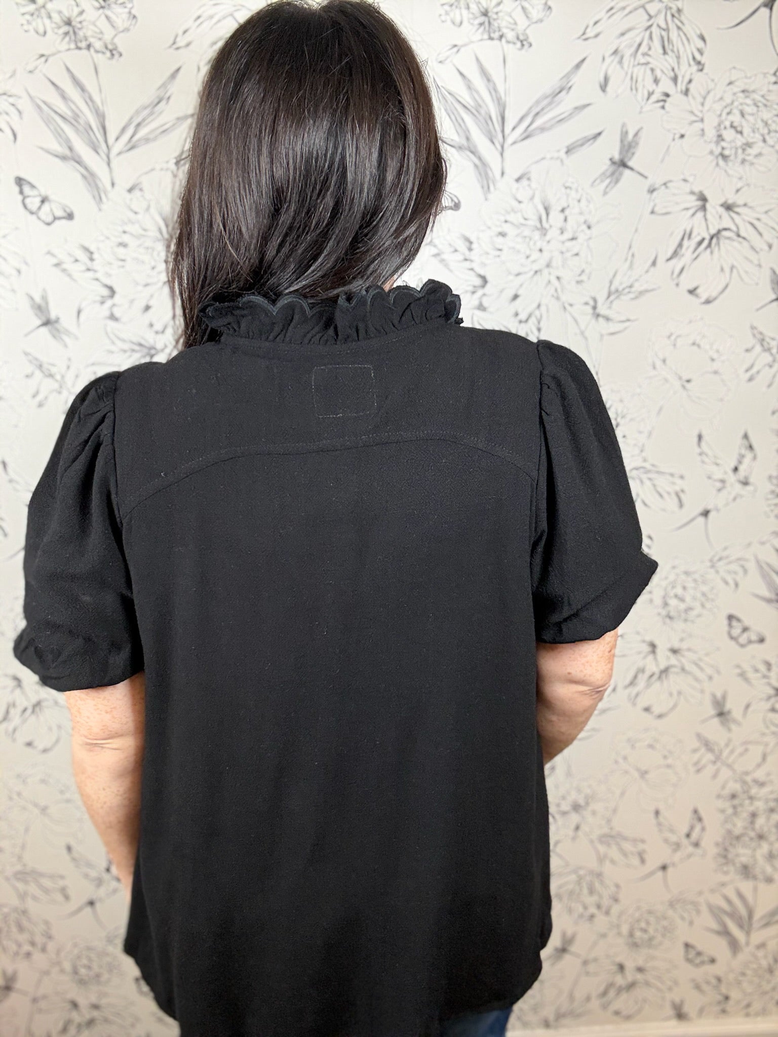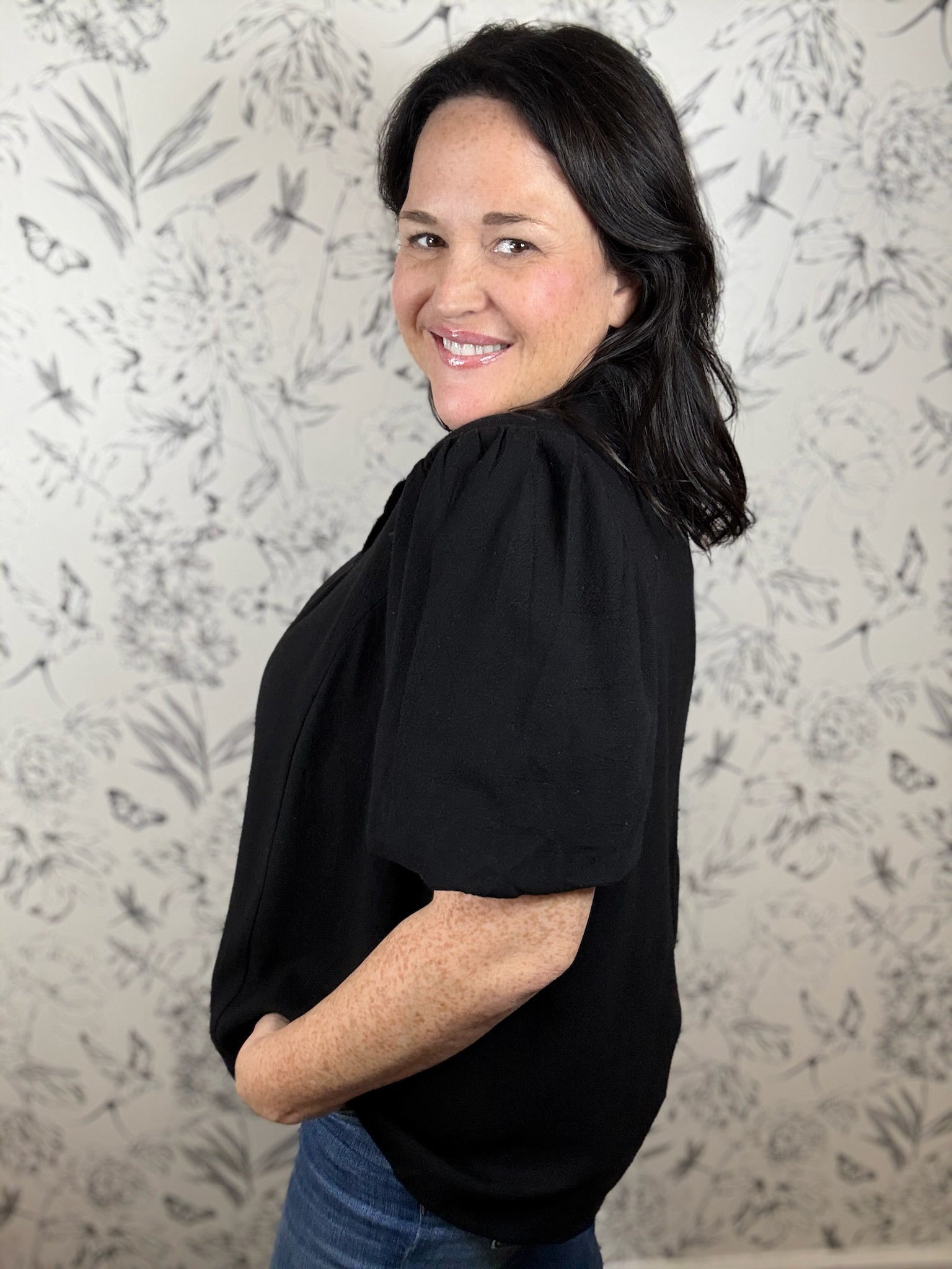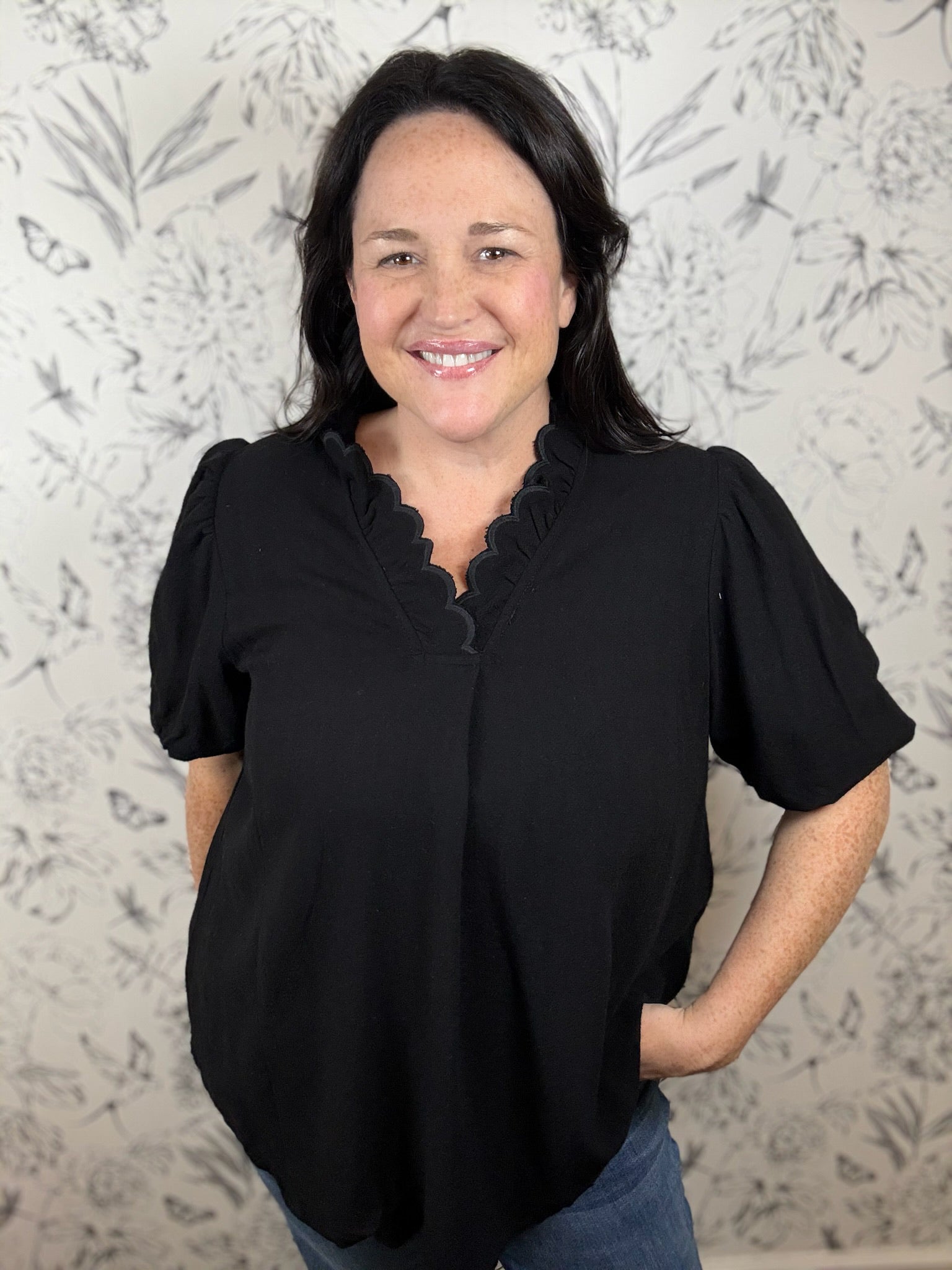 Soft Noir Top in Curvy: Enjoy the breezy charm of this linen blend top featuring a playful scallop-trimmed V-neck and flirty short puff sleeves. Lightweight and unlined, it’s perfect for easy, stylish days. Available in XL, 1XL, 2XL ONLY.