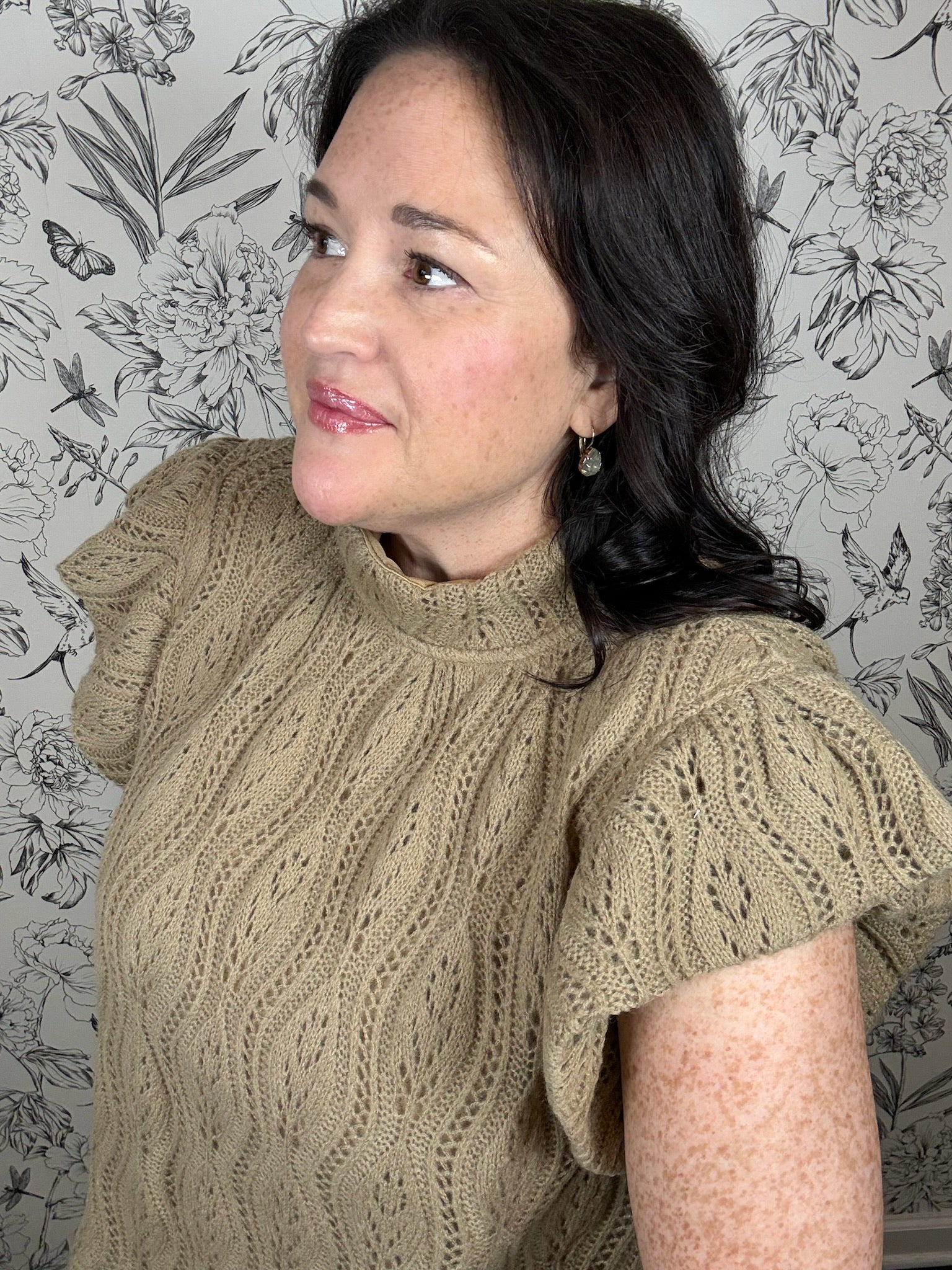 The Toffee Touch Top brings cozy charm with its soft cable knit pattern and fully lined comfort. Featuring playful short flutter sleeves and a chic low mock neck, this A-line fit top adds a flirty flair to your look. A button closure in the back completes the sweet, easy-to-wear style perfect for any casual outing.