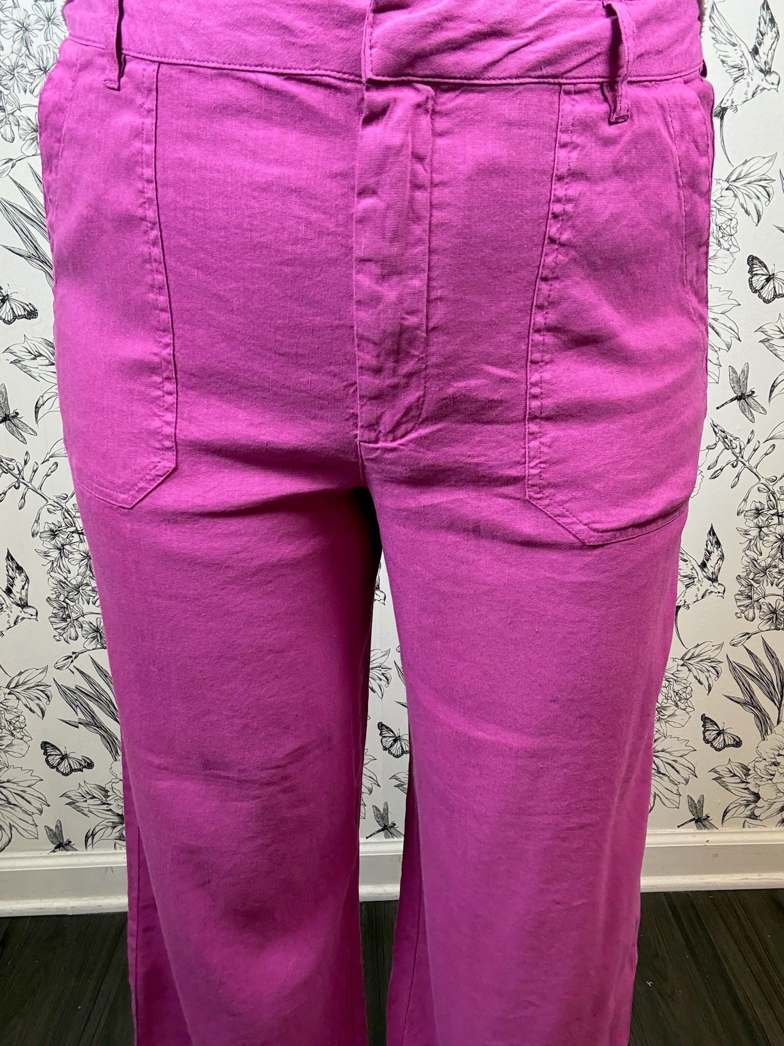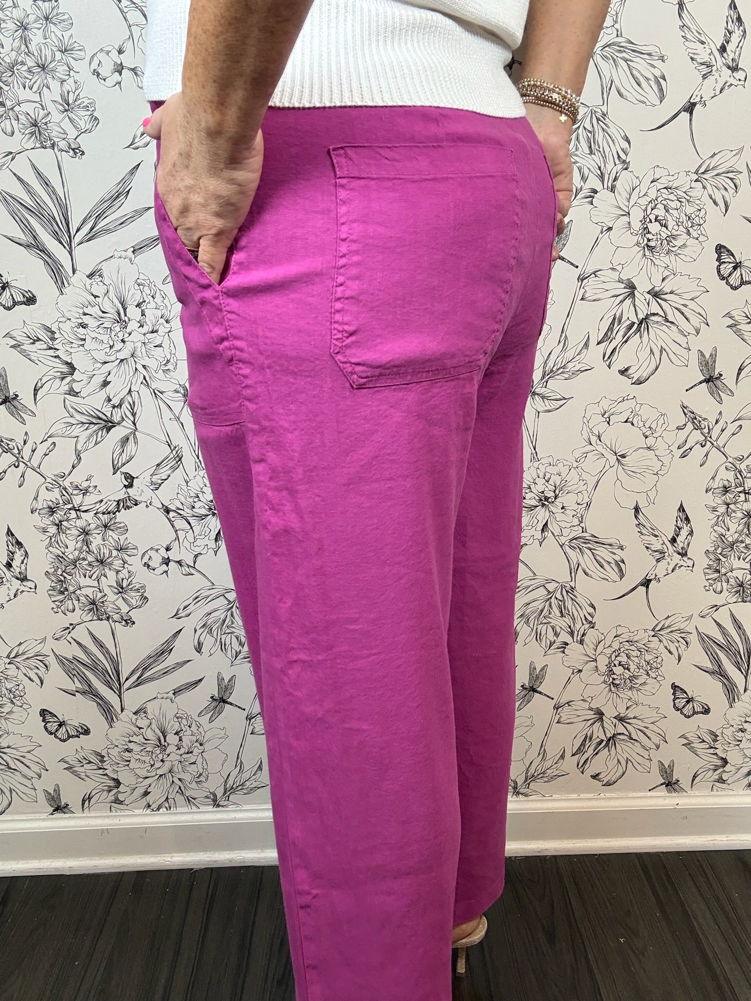 Experience effortless chic in these breathable, magenta linen-blend trousers. Featuring a flattering high-rise and functional pork chop pockets, these wide-leg ankle pants perfectly balance vibrant style with all-day airy comfort.