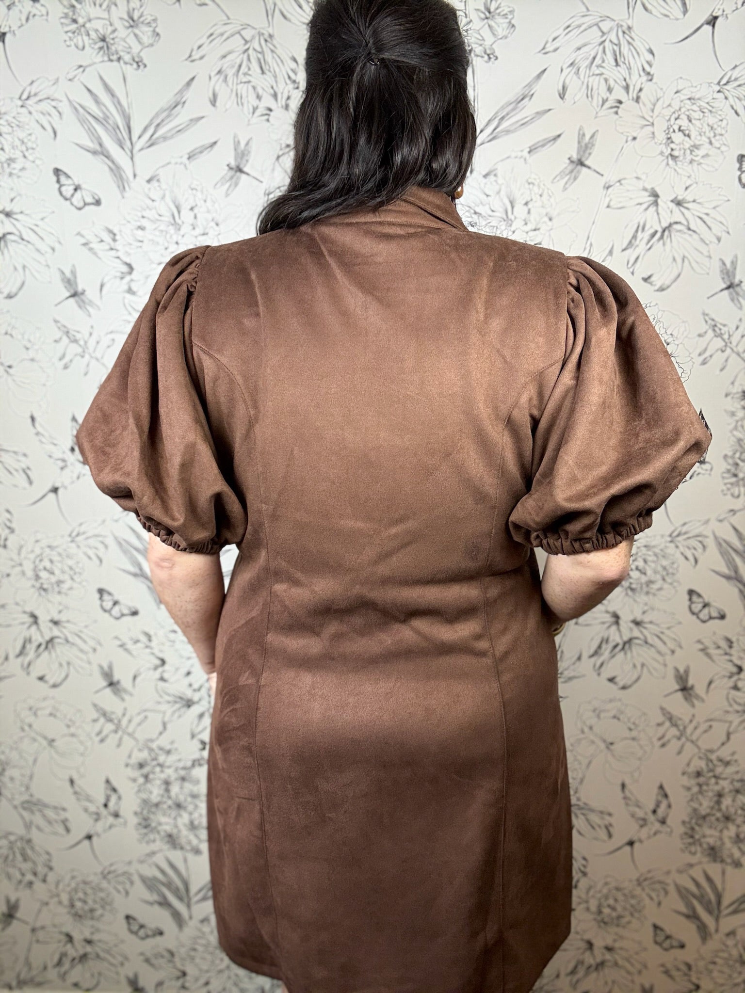 This playful chocolate suede mini dress, Truffle and Chic, features charming curved seams, cute short puff sleeves, a stylish collar, and a flattering shift silhouette that’s perfect for turning heads.