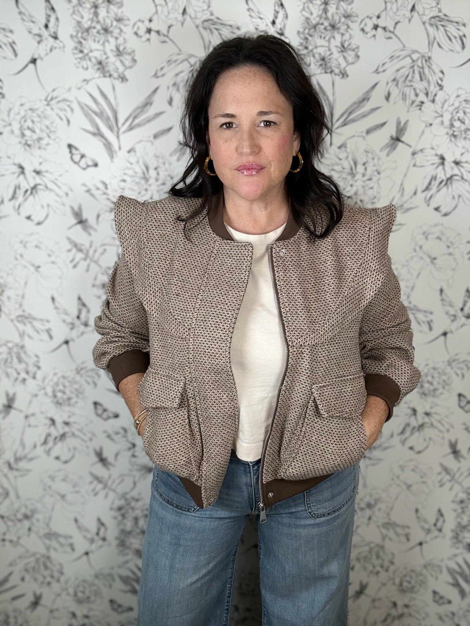 The Tweed & True bomber jacket brings a playful vibe with its perforated brown tweed-inspired design, zip closure, and cute ruffle trims. It features front square pockets, long sleeves, and contrasting knit edges for a stylish, fun look.