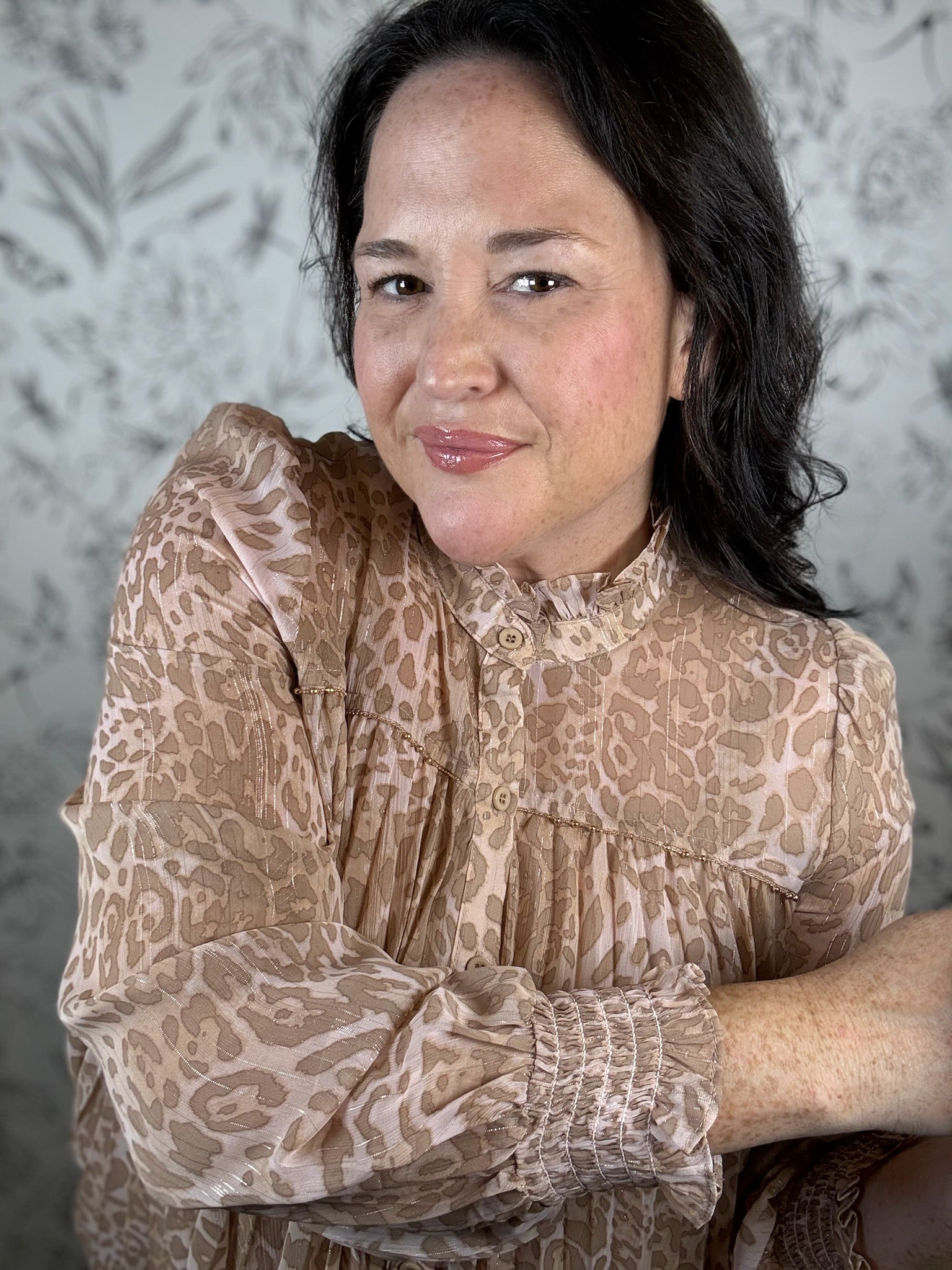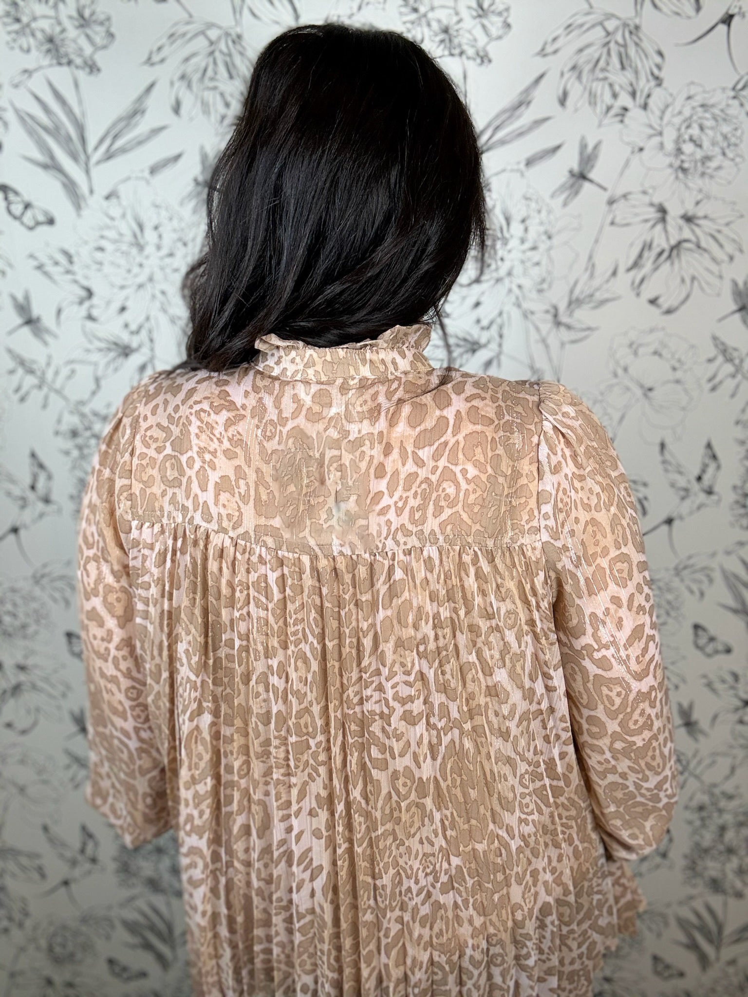 The Wild Whispers Blouse features a blush and champagne animal print with long sleeves, a button-front design, a pleated pintuck detail on the back, and a charming mock neck ruffle for a flirty touch.
