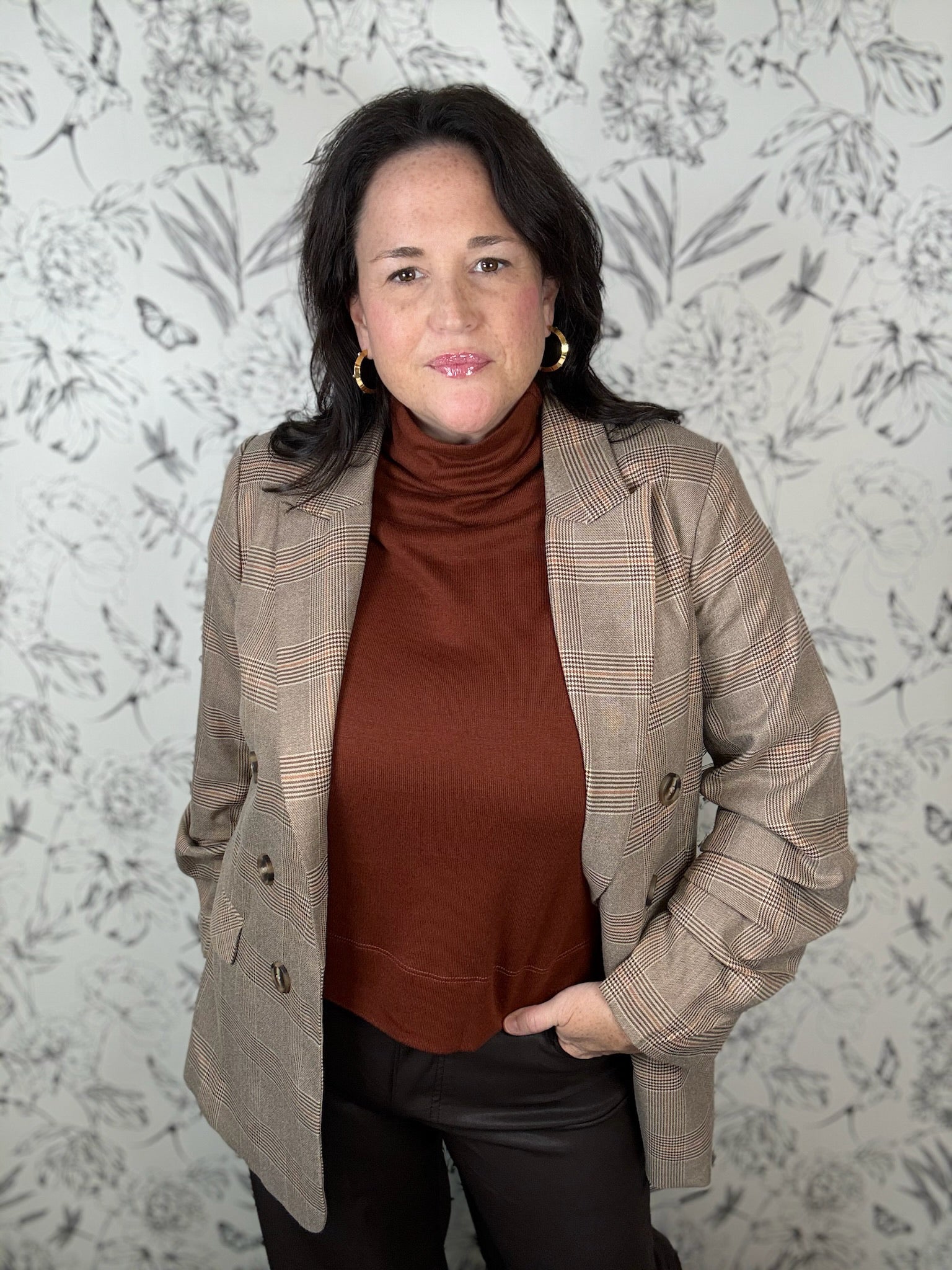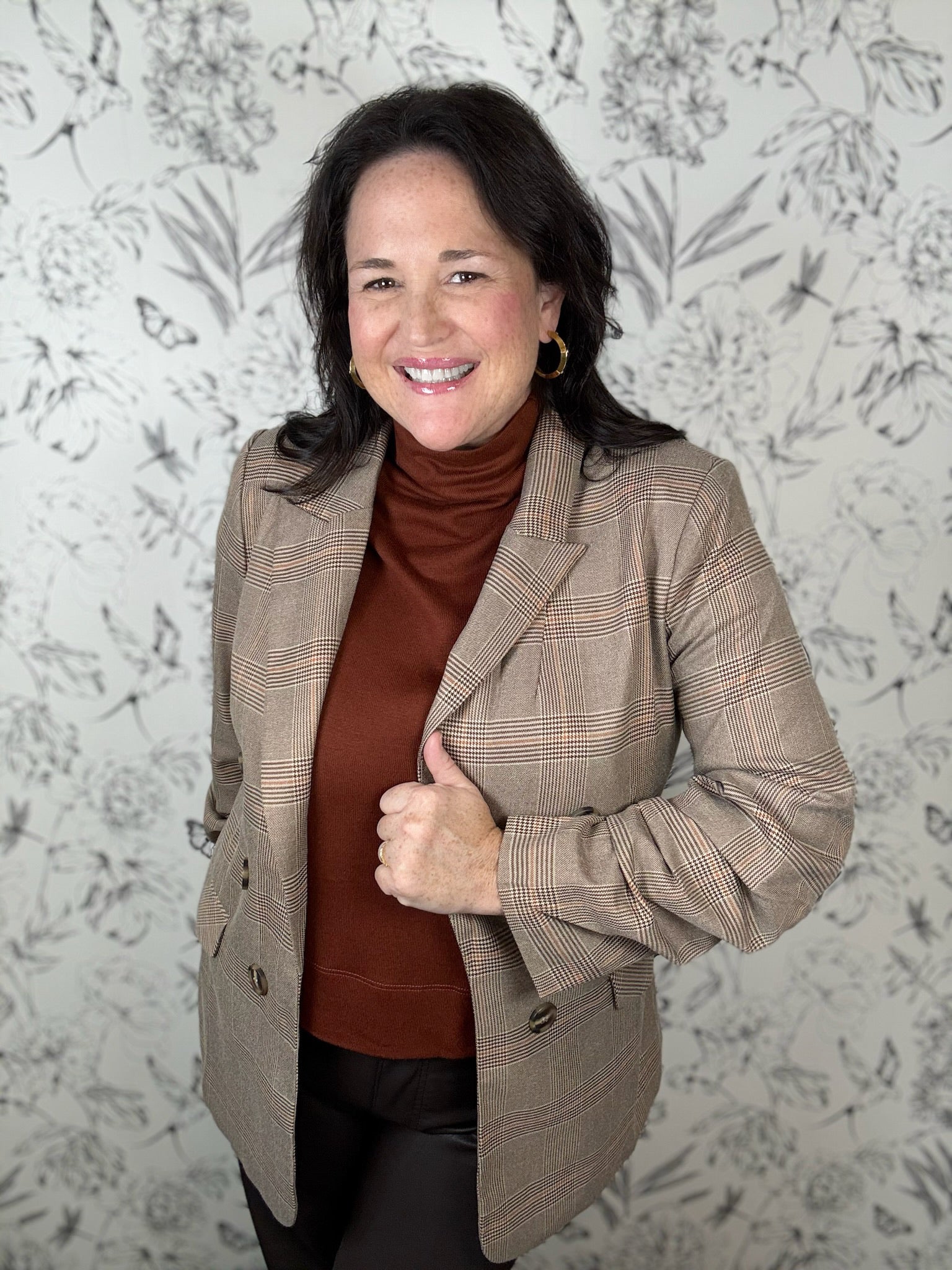 Introducing the Windsor Houndstooth Blazer, distinguished by its classic plaid pattern, elegant open-front design, subtly ruched 3/4 sleeves, functional flap pockets, and an extended boyfriend length that offers a polished layering option.