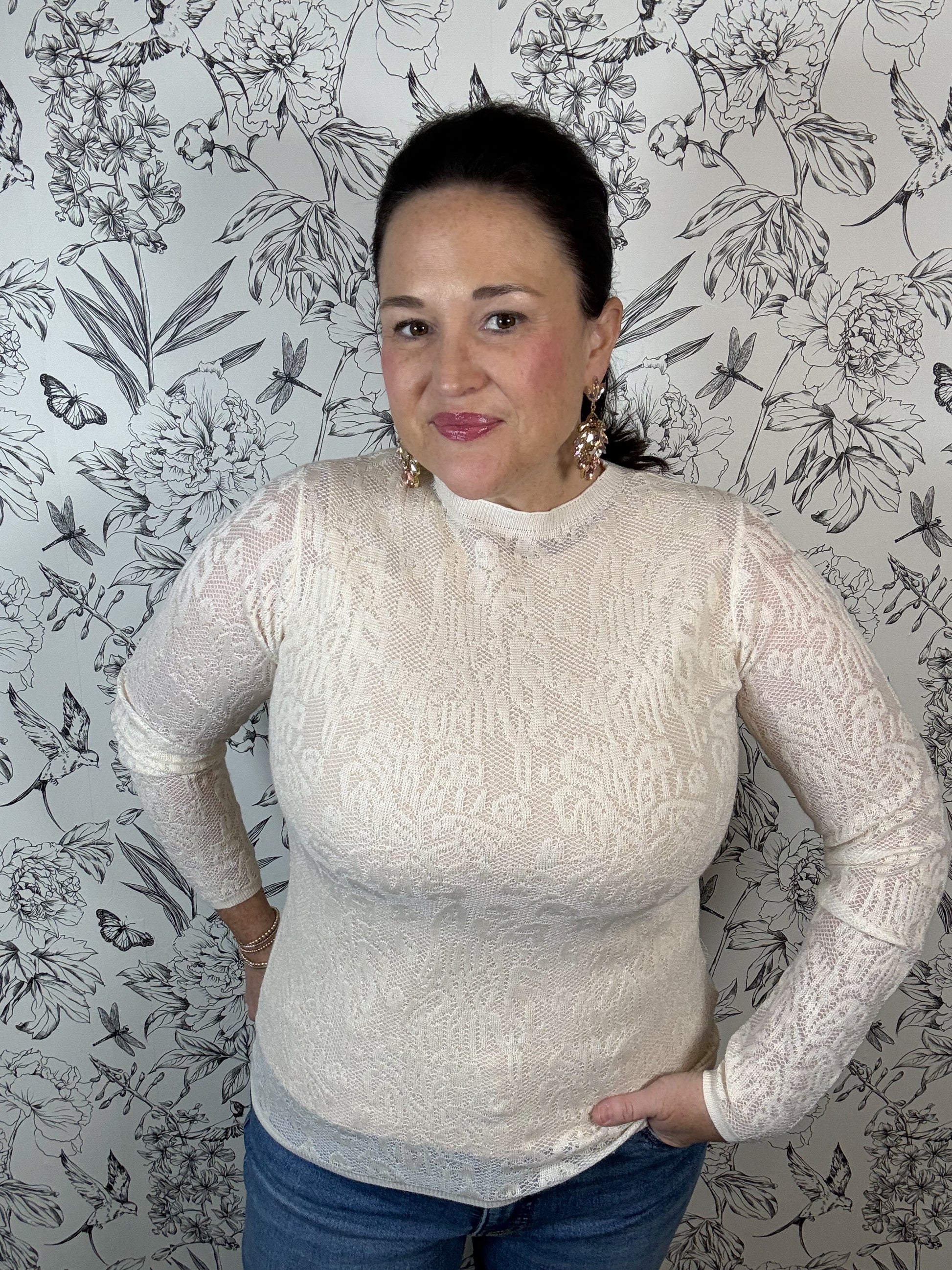 The Winter Haze Lace Top features a delicate cream-colored fine knit lace with long sleeves and a timeless fitted shape accented by a subtle mock neckline. Pair it elegantly with cream slacks for a refined look or jeans for an elevated casual fit. This piece is included in our Fireside Holiday Edit. It is semi-sheer and is intended to be worn with a camisole underneath. We paired it with the Two Sides to Love Tank.